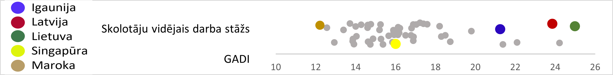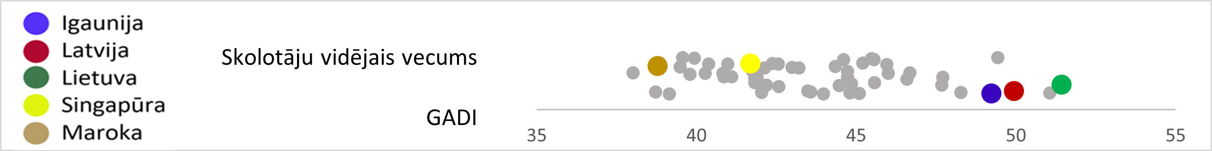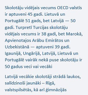Latvijā skolotāju vidējais vecums ir 50 gadi, tikai Lietuvā un Portugālē vidējais skolotāju vecums ir lielāks – 51 gads. Nākamie vecākie ir Ungārijas un Igaunijas skolotāji. Lietuvā un Portugālē 60 % skolotāju ir vecāki par 50 gadiem, Latvijā – 58 %. Kopš 2018. gada vidējais skolotāju vecums Latvijā un Lietuvā pieaudzis par 1,5 gadiem, Singapūrā par četriem, Igaunijā tas nav mainījies. Lielais vidējais vecums daļēji saistīts ar sabiedrības novecošanu, ilgāku darba mūžu. Tomēr turpmāko 10–15 gadu laikā puse no šo valstu skolotājiem pensionēsies, kas var radīt vēl lielākas problēmas ar skolotāju trūkumu. Skatoties no otras puses, – Turcijā vidējais skolotāju vecums ir 38 gadi, tikai 8 % skolotāju ir vecāki par 50 gadiem (skat. 2. att.).
