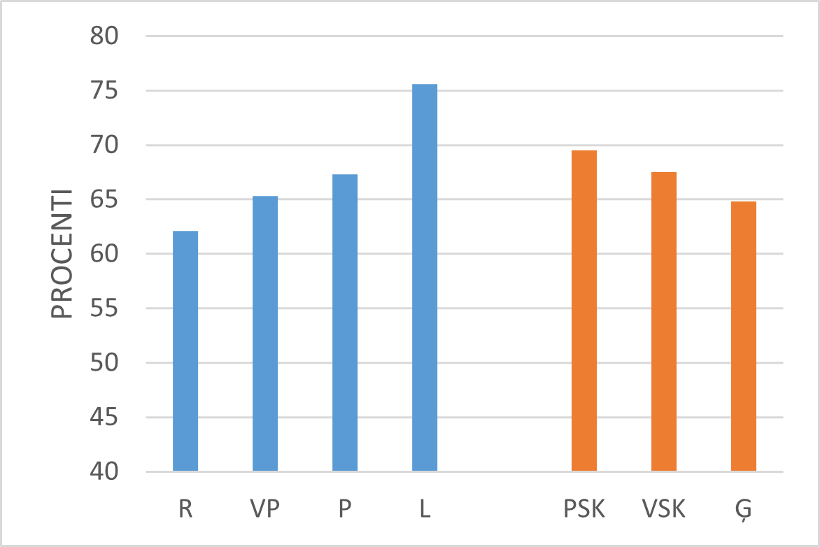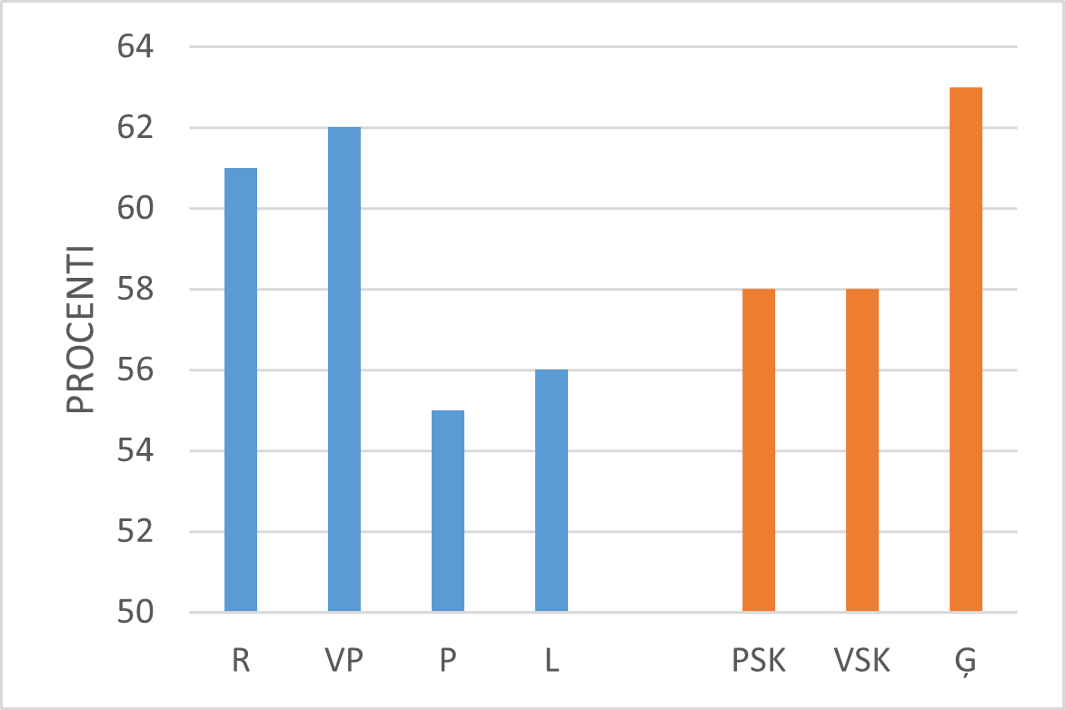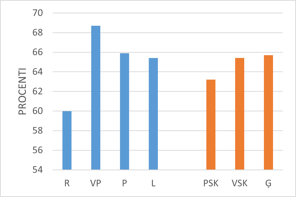 64. att. Skolotāju daļa, kuri skolēnos “bieži” vai “vienmēr” attīstījuši savu emociju, domu vai uzvedības izpratni. | 65. Skolotāju daļa, kuri skolēnos “bieži” vai “vienmēr” attīstījuši savu emociju, domu vai uzvedības pārvaldīšanu. |