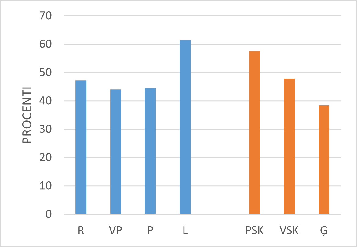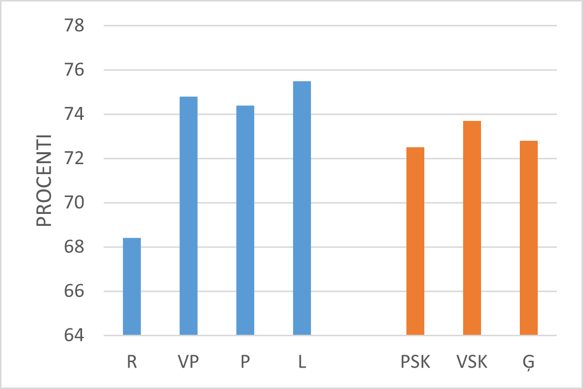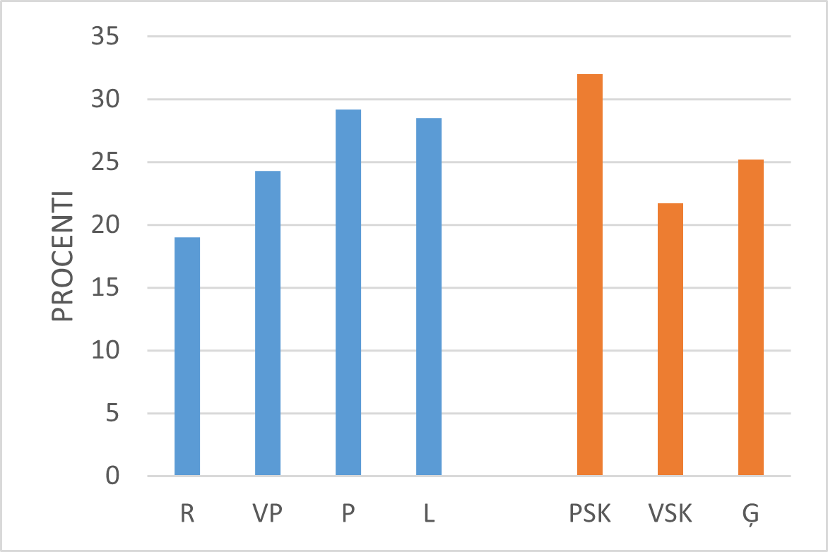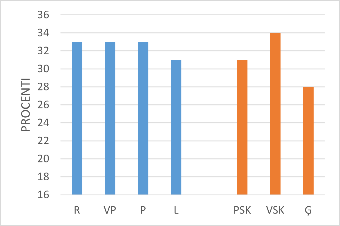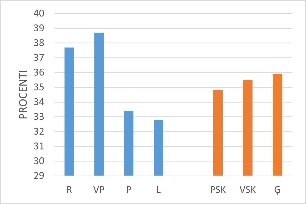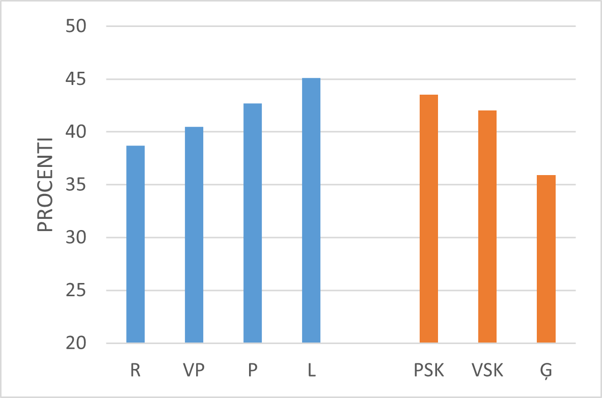 Aplūkojot skolotāju kognitīvās aktivācijas darbības Latvijā, jāsecina, ka mazāk tās izpaužas ģimnāzijās (skat. 34.–35. att.).