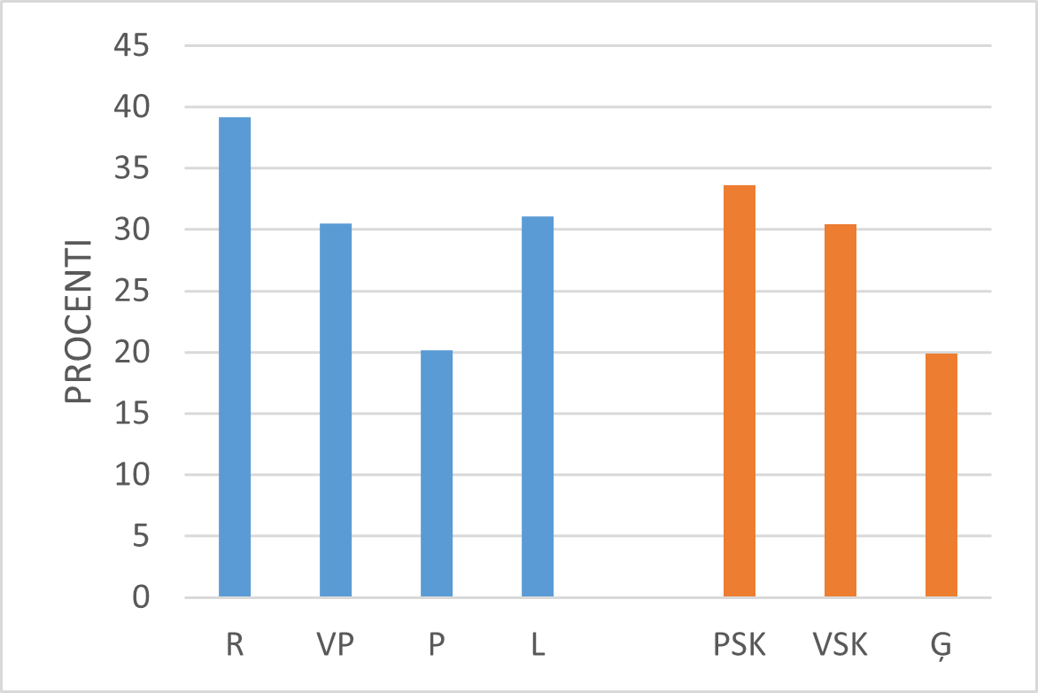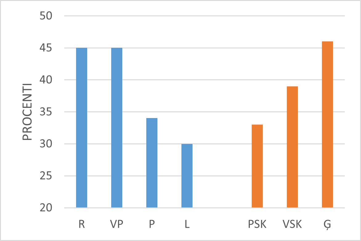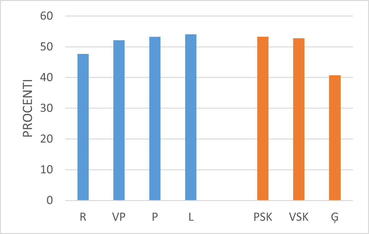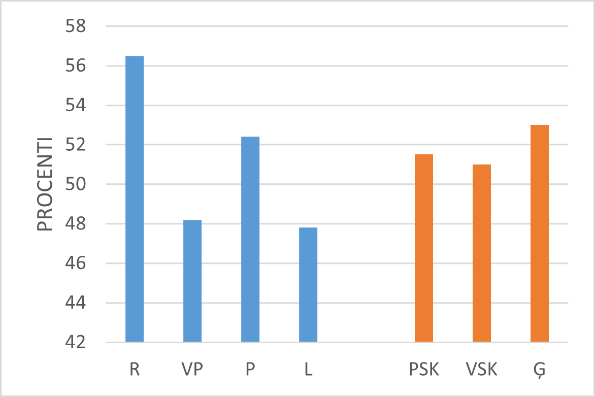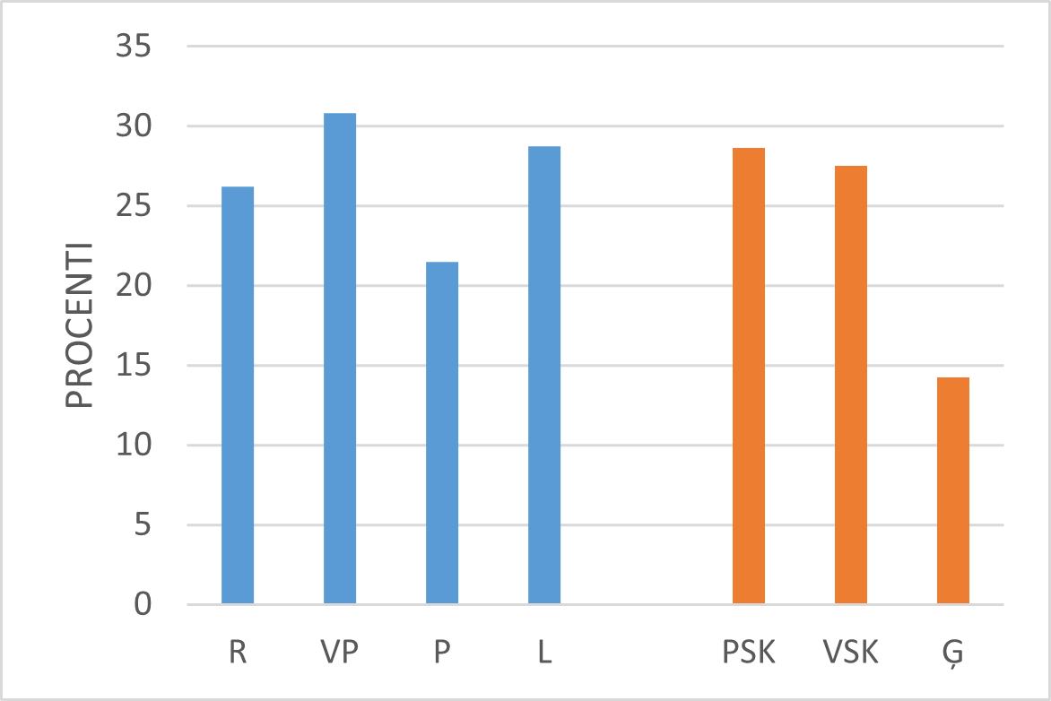 Aplūkojot skolotāju kognitīvās aktivācijas darbības Latvijā, jāsecina, ka mazāk tās izpaužas ģimnāzijās (skat. 34.–35. att.).
