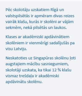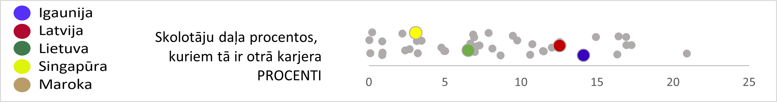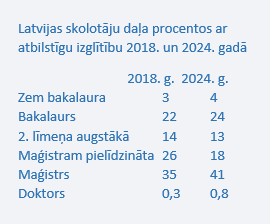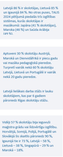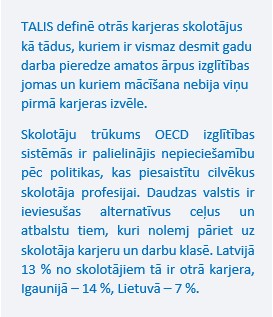 Latvijā 13 % no skolotājiem tā ir otrā karjera, Igaunijā – 14 %, Lietuvā – 7 %.