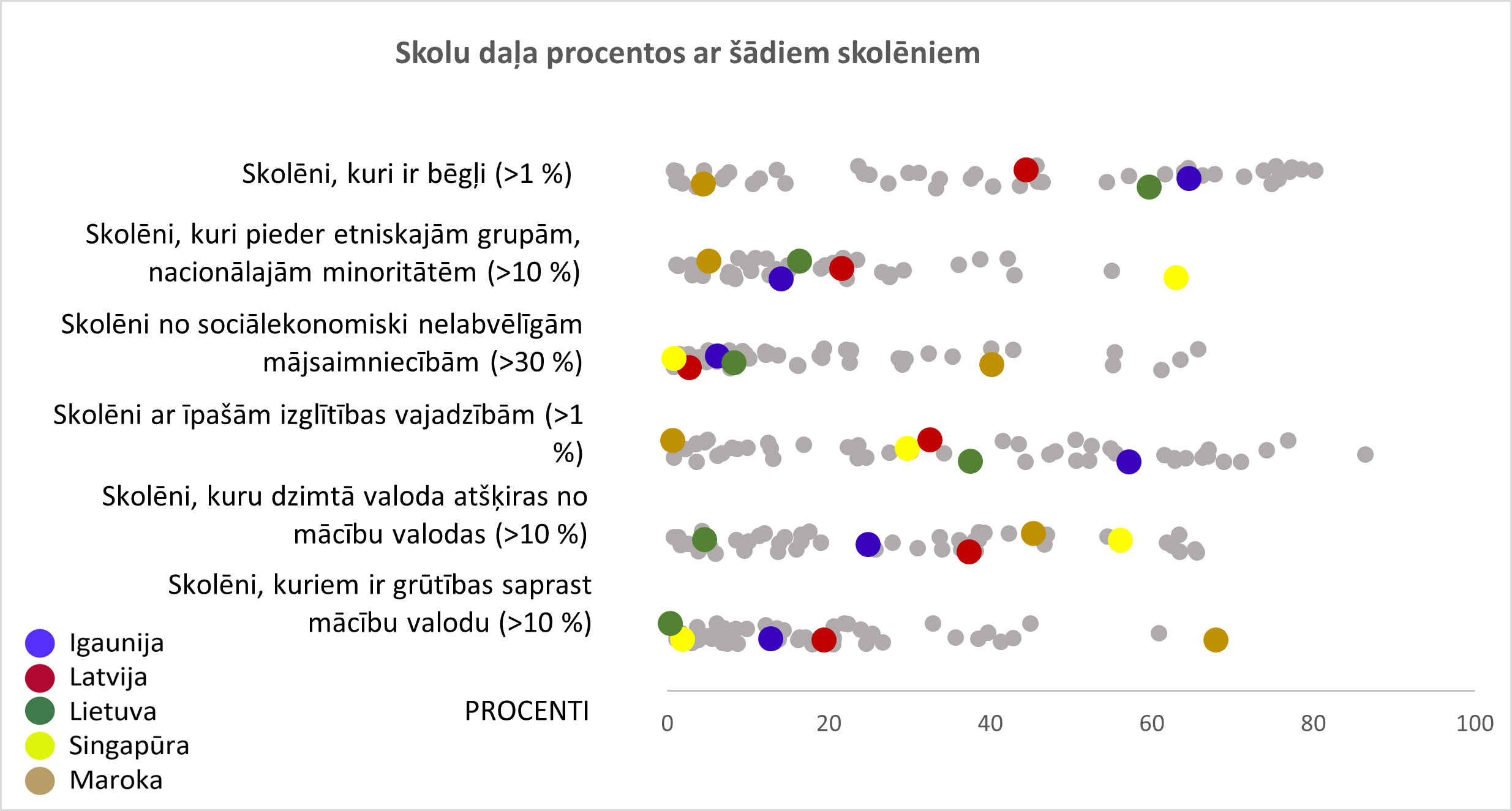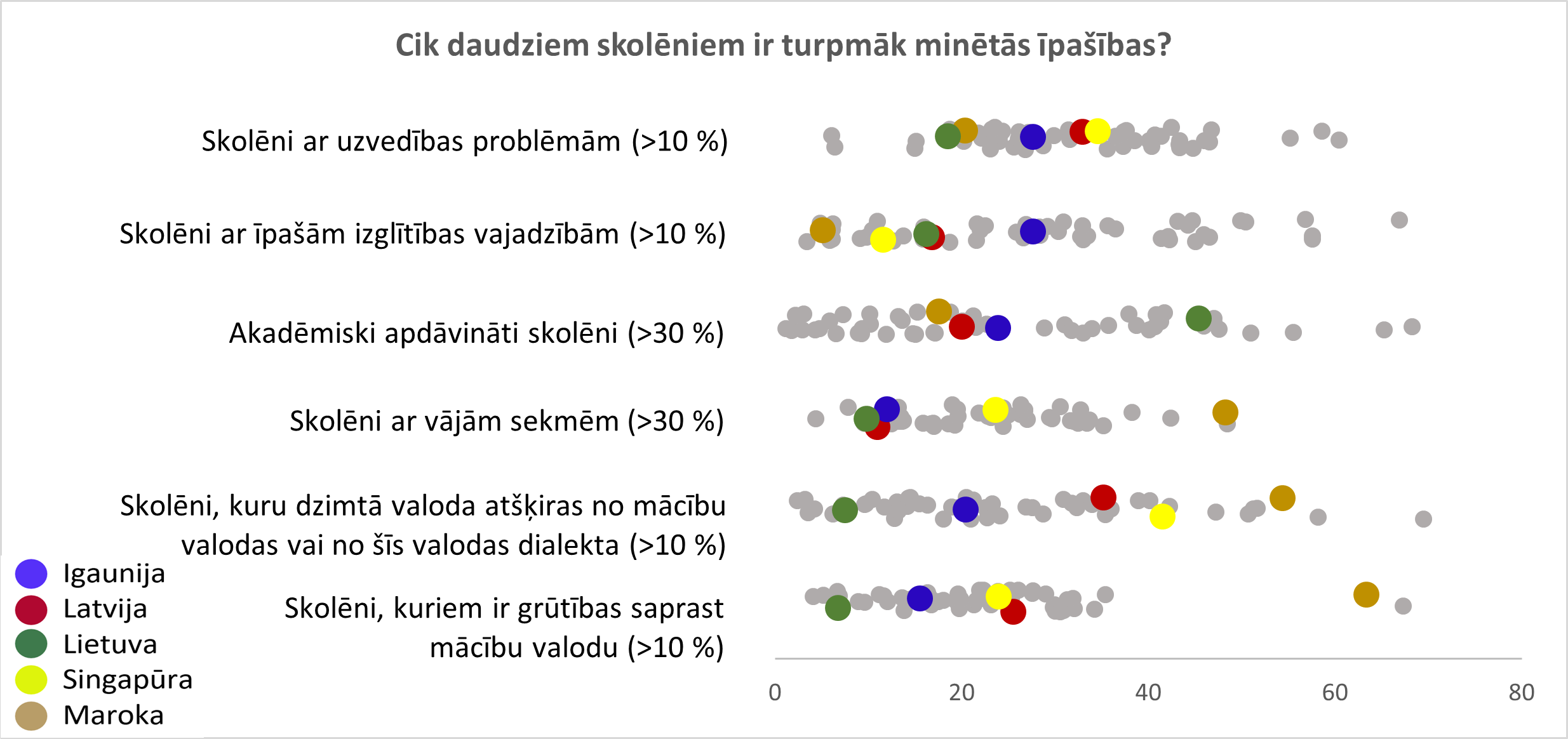 Skolotājiem apgrūtinoši strādāt klasē, kurā skolēniem ir grūtības saprast mācību valodu. Latvijā 26 % skolotāju ziņo, ka klasē šādu skolēnu ir vairāk par 10 %. Ņemot vērā Latvijas klašu lielumu, 10 % parasti atbilst 2 vai 3 skolēniem. Līdzīga situācija ir Singapūrā (24 %), mazāk šādu klašu ir Igaunijā (16 %) un Lietuvā (7 %). Toties Marokā un Dienvidāfrikā šādu klašu ir apmēram divas trešdaļas (64 % un 67 %). Latvijas pilsētu un lauku skolās šādu klašu (15 % un 18 %) divreiz mazāk nekā Rīgā (37 %) un valstspilsētās (35 %) (skat. 14. att.). Līdzīgs jautājums ir par skolēnu dzimto valodu. Latvijā šādu klašu ir ap trešdaļu (35%), Igaunijā 21 %, Lietuvā tikai 8 %. Sadalījumu pa slāņiem skatīt 15. un 16. att.