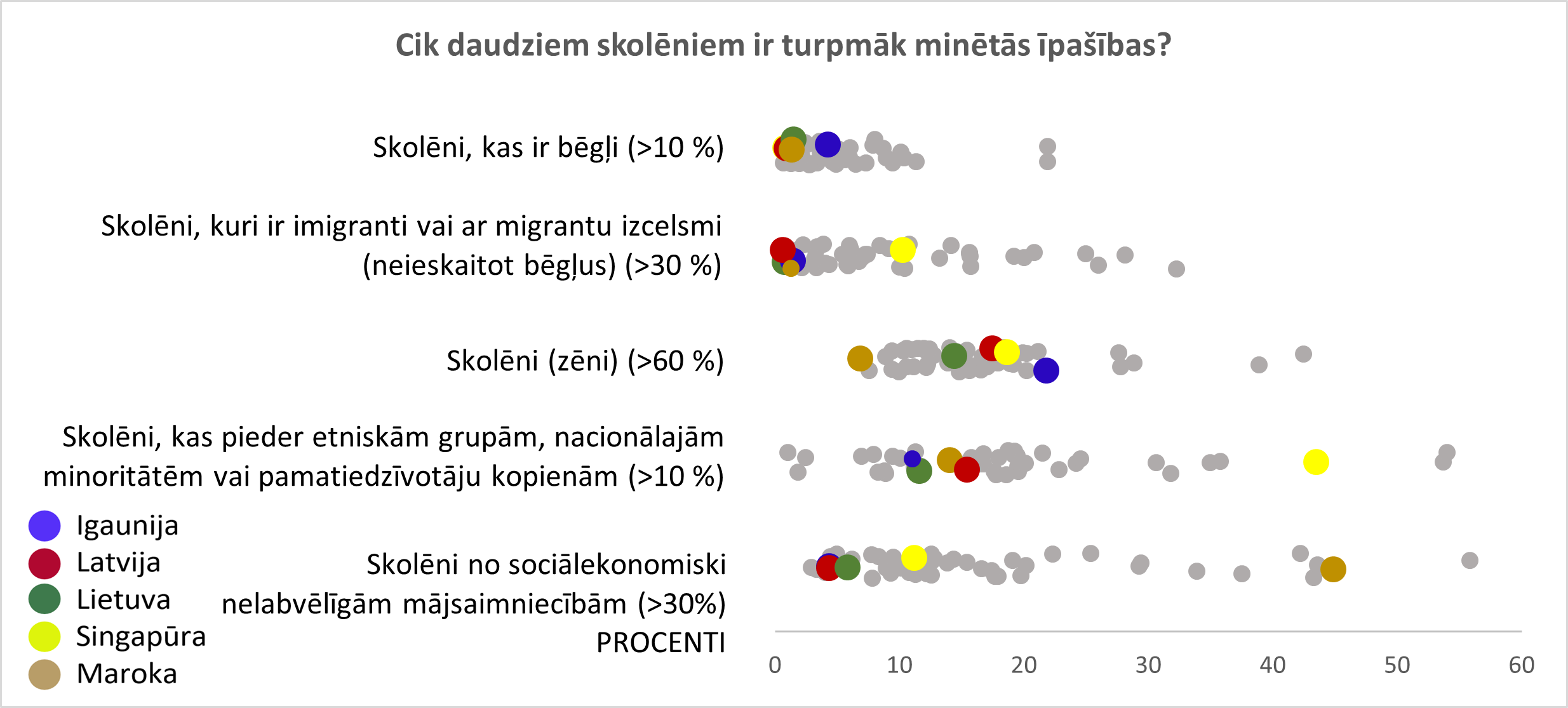 2024. gadā skolās ar dažādu skolēnu loku strādāja vairāk skolotāju nekā 2018. gadā, jo īpaši skolās, kurās vismaz 1 % skolēnu ir bēgļi (vidēji par 22 procentpunktiem vairāk). Skolotāju skaits, kas strādā skolās, kurās vairāk nekā 30 % skolēnu nāk no sociālekonomiski nelabvēlīgām ģimenēm, vidēji tajā pašā laika posmā nav mainījies.