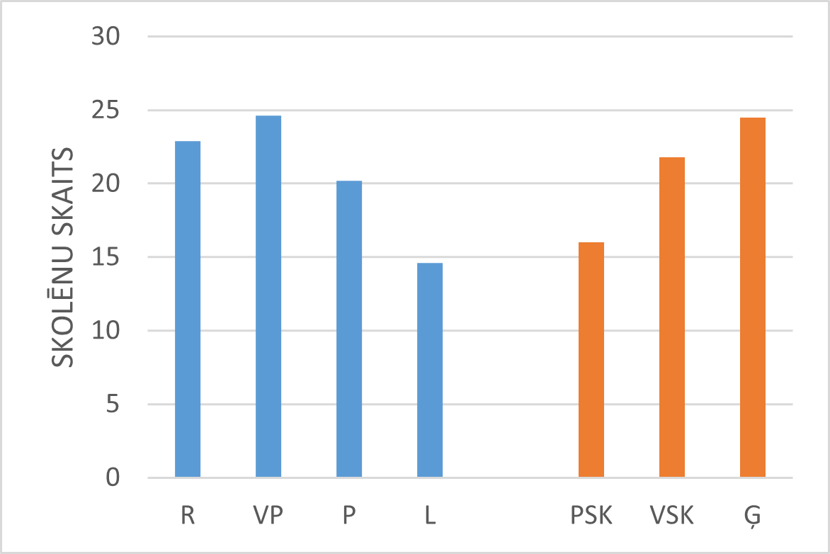 21. att. Klasē ir vairāk par 30% skolēnu no sociālekonomiski nelabvēlīgām mājsaimniecībām. | 22. att. Skolēnu skaits klasē. |