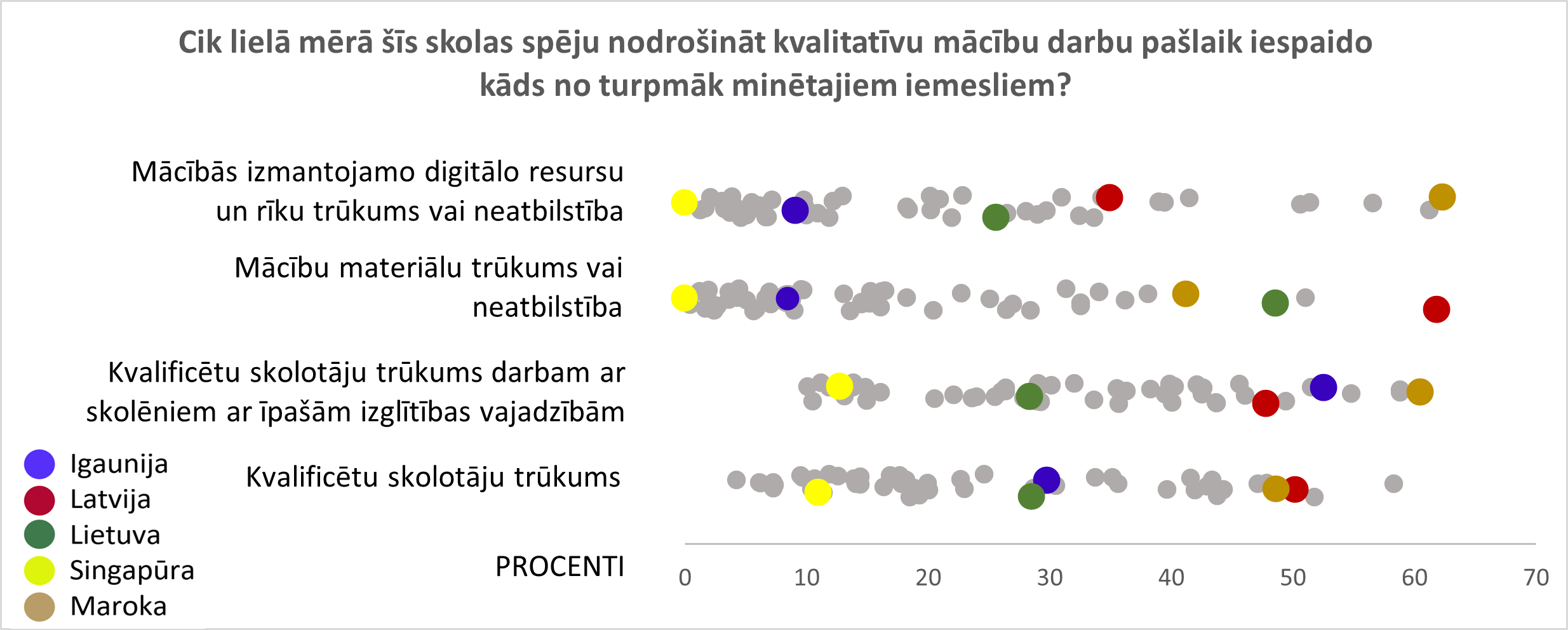 Uz strukturāliem šķēršļiem, kas var ierobežot kvalitatīvas mācības, norāda skolu direktori. 23 % skolotāju strādā skolās, kuras ziņo, ka kvalificētu skolotāju trūkums ierobežo viņu skolas spēju nodrošināt kvalitatīvu mācību procesu. Šīs bažas ir īpaši izplatītas Bahreinā, Latvijā un Nīderlandē, kur aptuveni puse skolotāju strādā skolās, kuras ziņo par šo šķērsli. Norvēģijā, Polijā un Zviedrijā mazāk par 10 % skolotāju strādā skolās, kuras ziņo par šādām bažām. Bieži sastopams šķērslis, par ko ziņots visās OECD izglītības sistēmās, ir tādu skolotāju trūkums, kuru kompetence ļauj mācīt skolēnus ar īpašām izglītības vajadzībām. Vidēji 33 % skolotāju strādā skolās, kur par šādu prasmju trūkumu tika ziņots kā par problēmu. Latvijā gandrīz puse skolotāju strādā skolās, kur šāda situācija tiek uztverta kā izaicinājums.