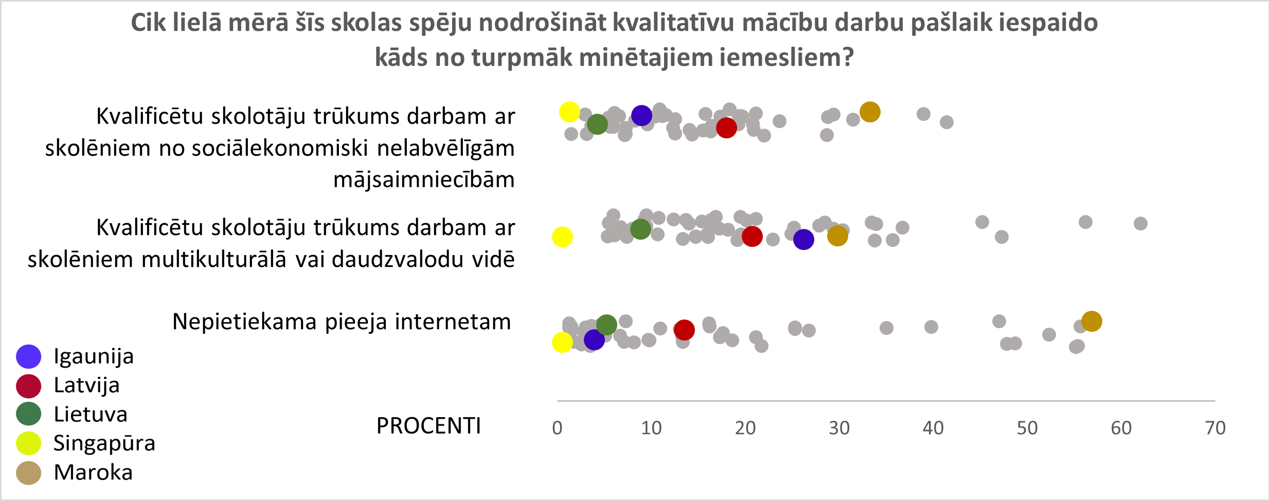 Latvijā 14 % skolotāju strādā skolās ar nepietiekamu pieeju internetam. Lai arī šis skaitlis neliekas liels, tas ir vairāk nekā lielākajā daļā pētījuma dalībvalstu, daudz vairāk nekā Lietuvā (4 %), Igaunijā (5 %) un Singapūrā (0,6 %). Arī mācībās izmantojamo digitālo resursu un rīku trūkums, kas ietekmē Latvijas skolu spēju nodrošināt kvalitatīvu mācību darbu, ir ļoti liels. Tikai dažās valstīs tas ir vēl lielāks. Īpaši jāuzsver Latvijas izglītības sistēmas problēma ar mācību materiāliem. To trūkums ietekmē 62 % skolotāju, kas ir vislielākais skaitlis visās pētījuma dalībvalstīs. Līdz ar to Latvijas skolotājiem ir lielākais stress, kas saistīts ar sagatavošanos stundām (skat, tālāk šajā ziņojumā).