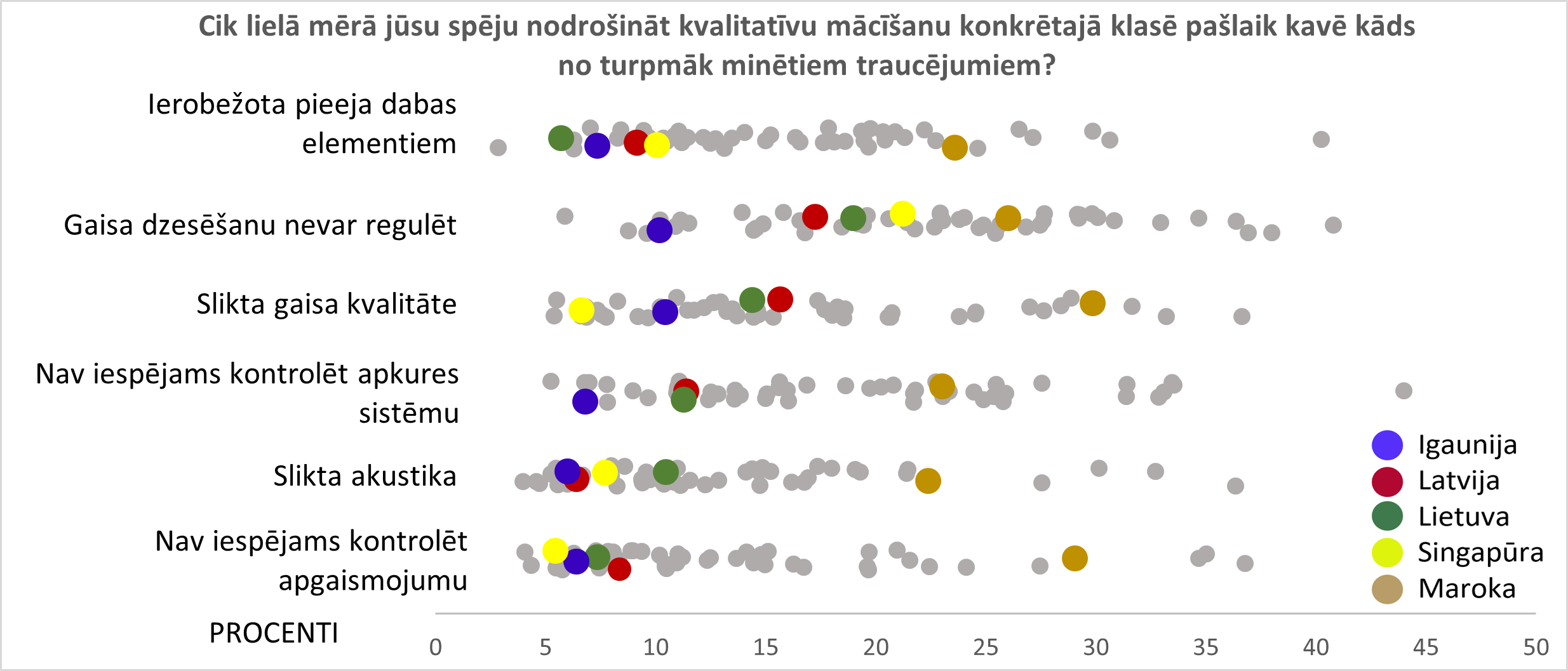 Arī skolotājiem tika uzdoti jautājumi par skolas iekārtojama nepilnību iespējamo ietekmi uz kvalitatīvām mācībām. Latvijas skolotāji biežāk norāda uz problēmām ar pārāk karstu klasi (17 %) un sliktām vēdināšanas iespējām (16 %) (skat. 26. att.). Lai arī kopumā Latvijā šīs problēmas nav lielas, tomēr tās lielākoties ir biežāk sastopamas nekā Igaunijā un Lietuvā. Apskatot atsevišķos slāņus (skat. 27.–30. att.), redzams, ka atšķirības nav lielas – dažu procentpunktu robežās. Piemēram, pamatskolās 12 % skolotāju norāda uz slikto gaisa kvalitāti, bet citās skolās – 18 %. To noteikti var saistīt ar vidēji daudz mazāko skolēnu skaitu klasēs.