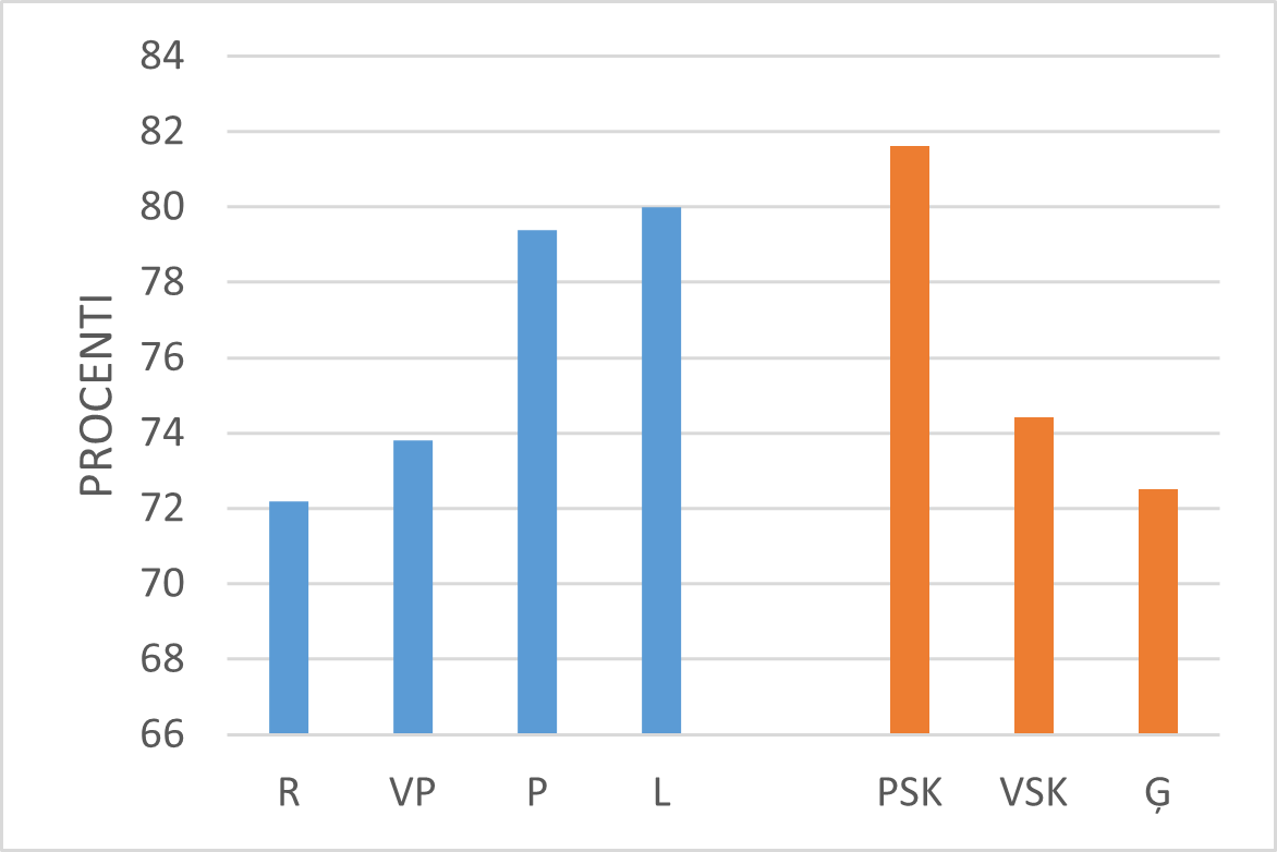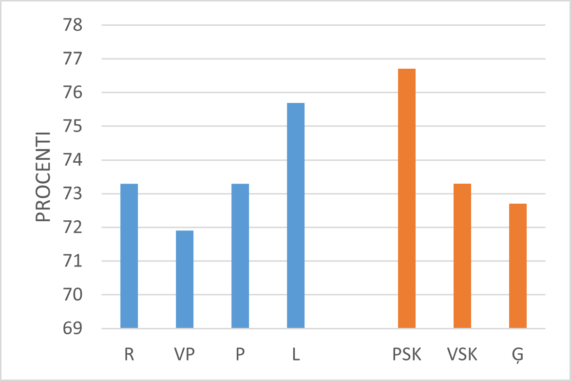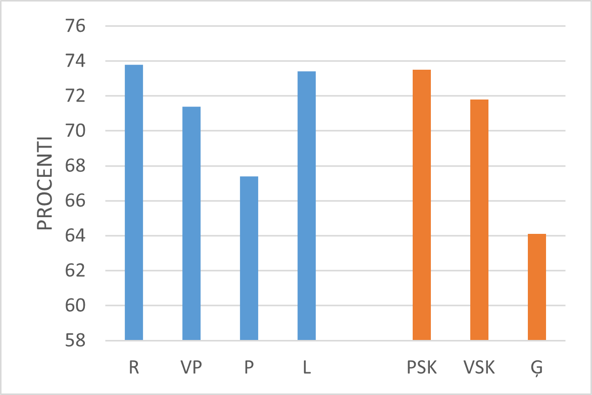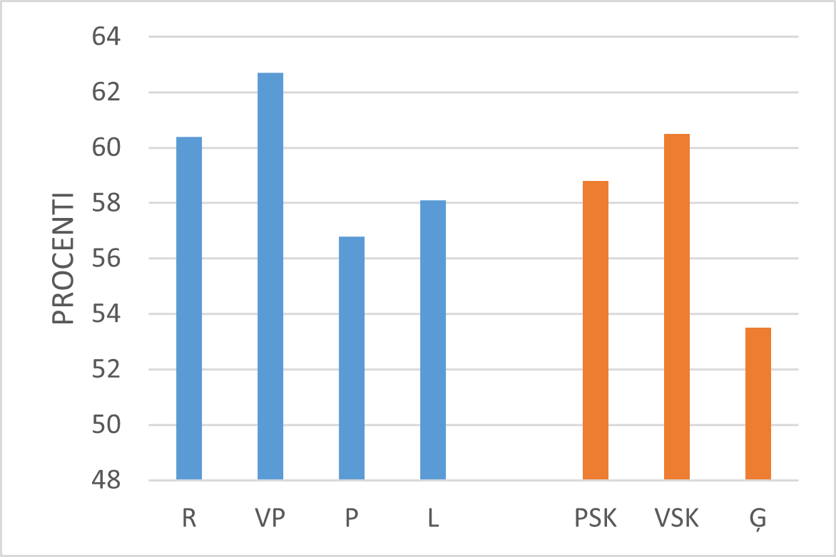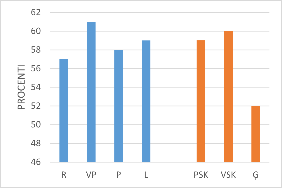 | 64. att. Skolotāju daļa, kuri skolēnos “bieži” vai “vienmēr” attīstījuši savu emociju, domu vai uzvedības izpratni. | 65. Skolotāju daļa, kuri skolēnos “bieži” vai “vienmēr” attīstījuši savu emociju, domu vai uzvedības pārvaldīšanu. |