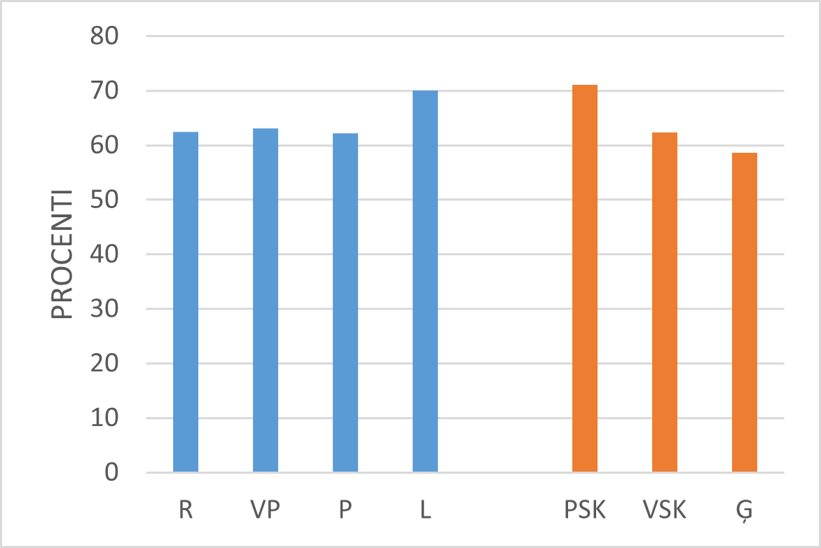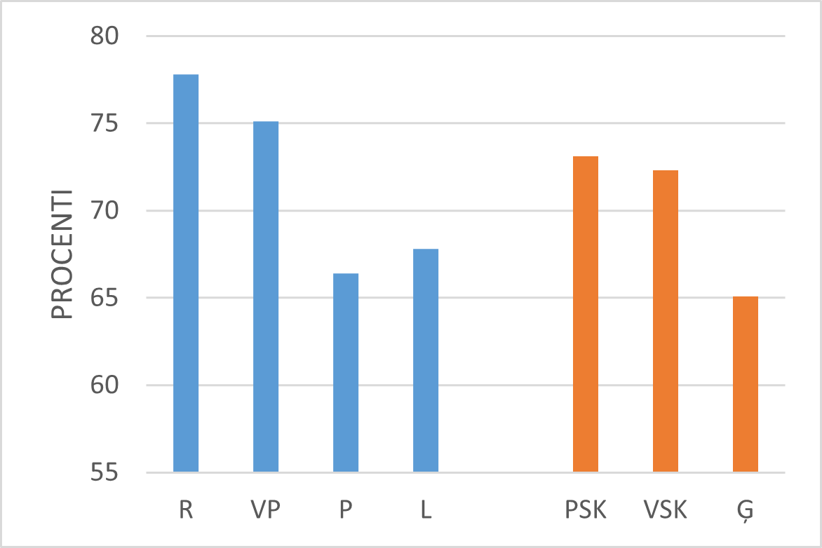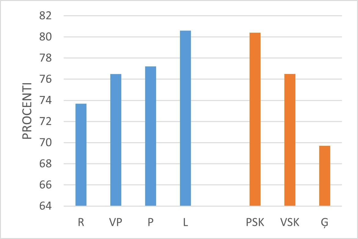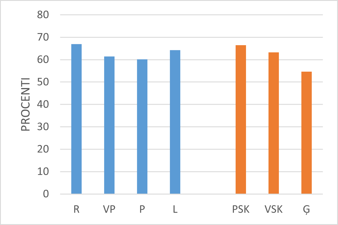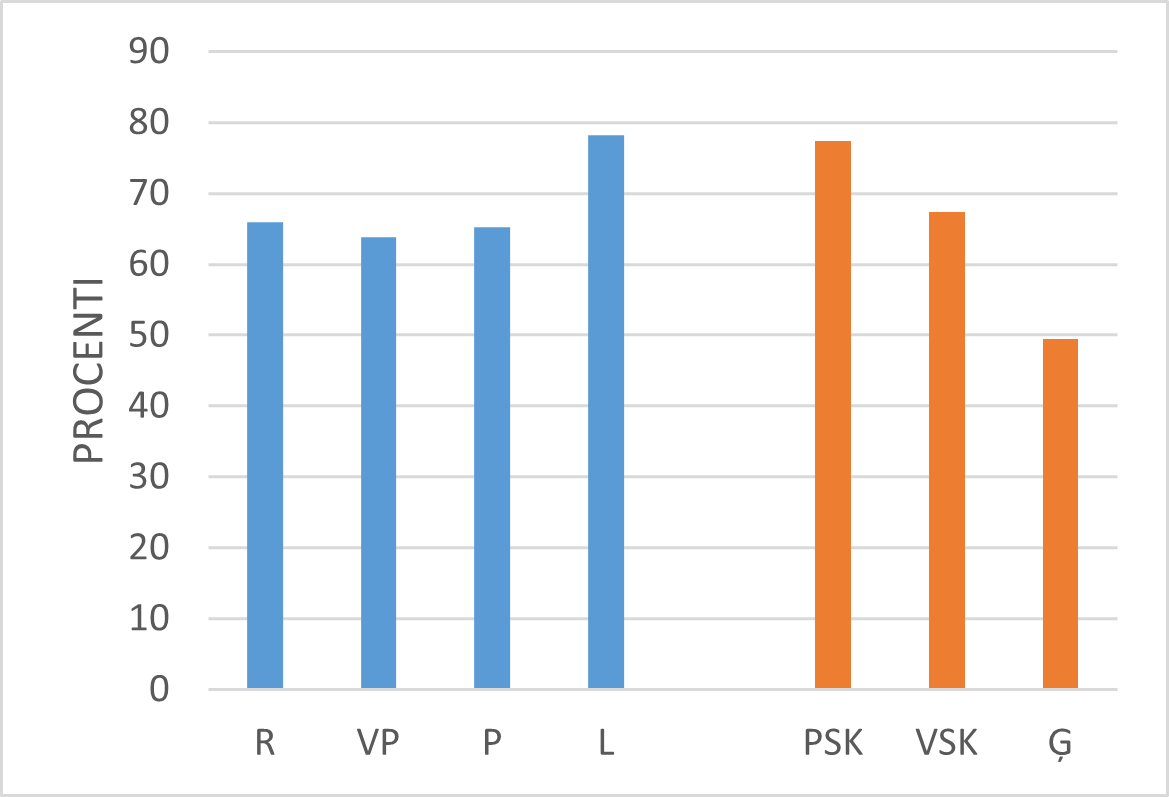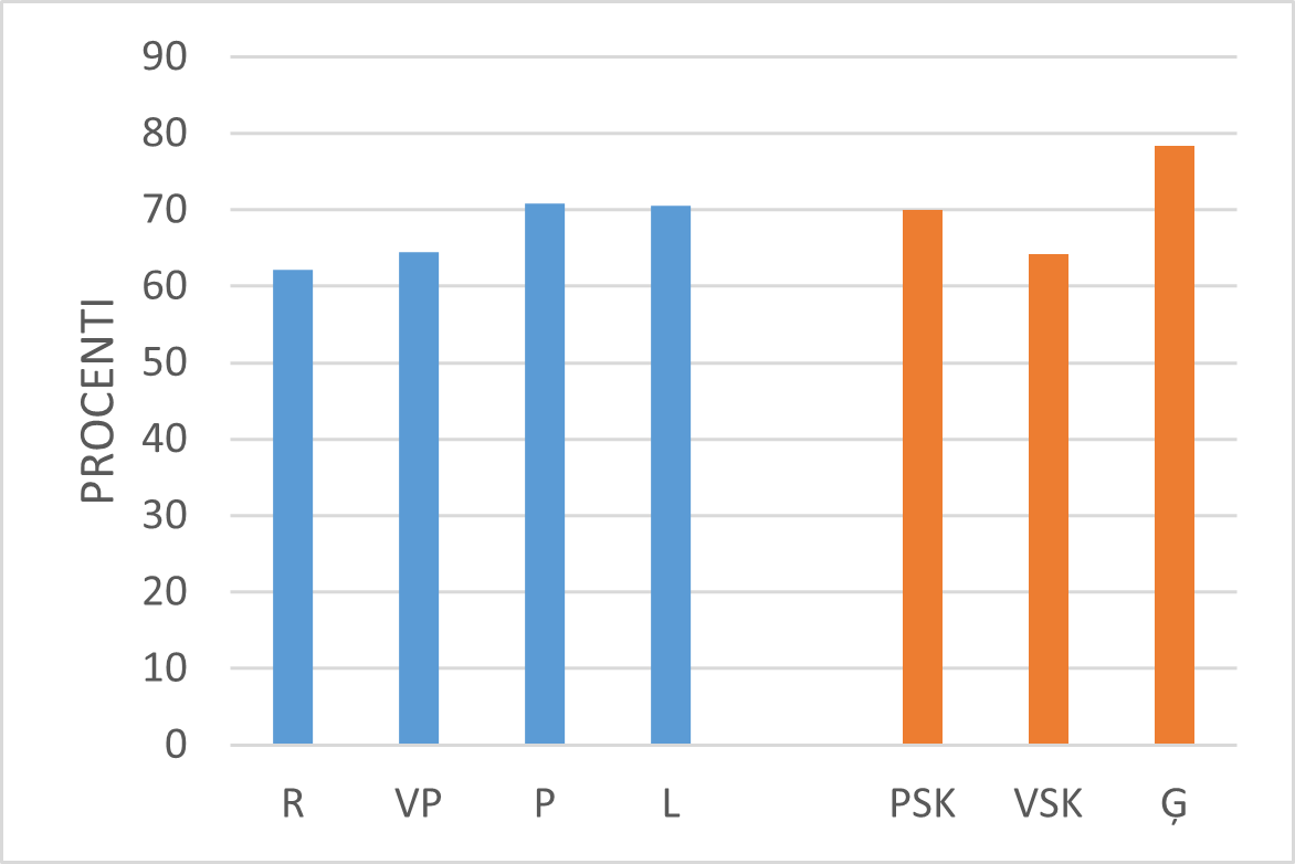 | 64. att. Skolotāju daļa, kuri skolēnos “bieži” vai “vienmēr” attīstījuši savu emociju, domu vai uzvedības izpratni. | 65. Skolotāju daļa, kuri skolēnos “bieži” vai “vienmēr” attīstījuši savu emociju, domu vai uzvedības pārvaldīšanu. |