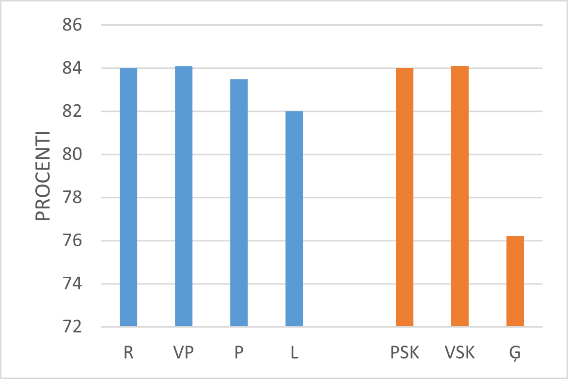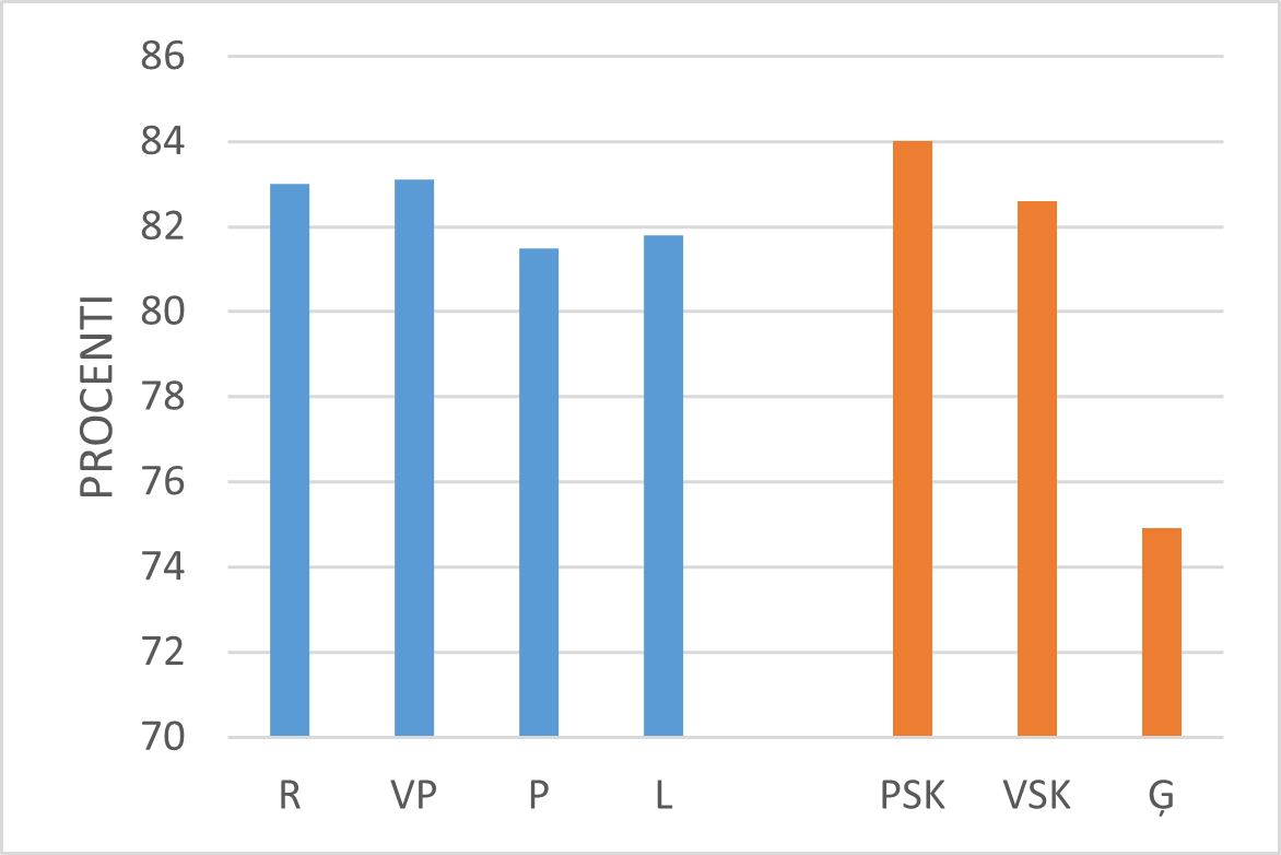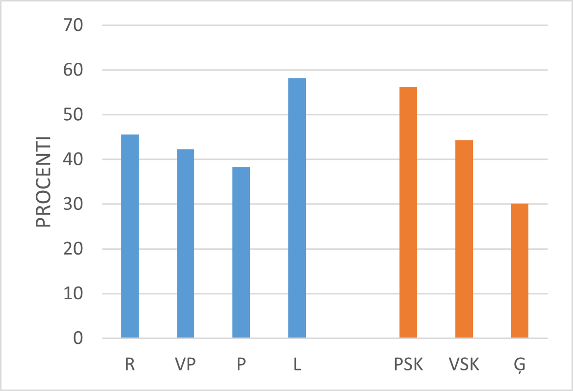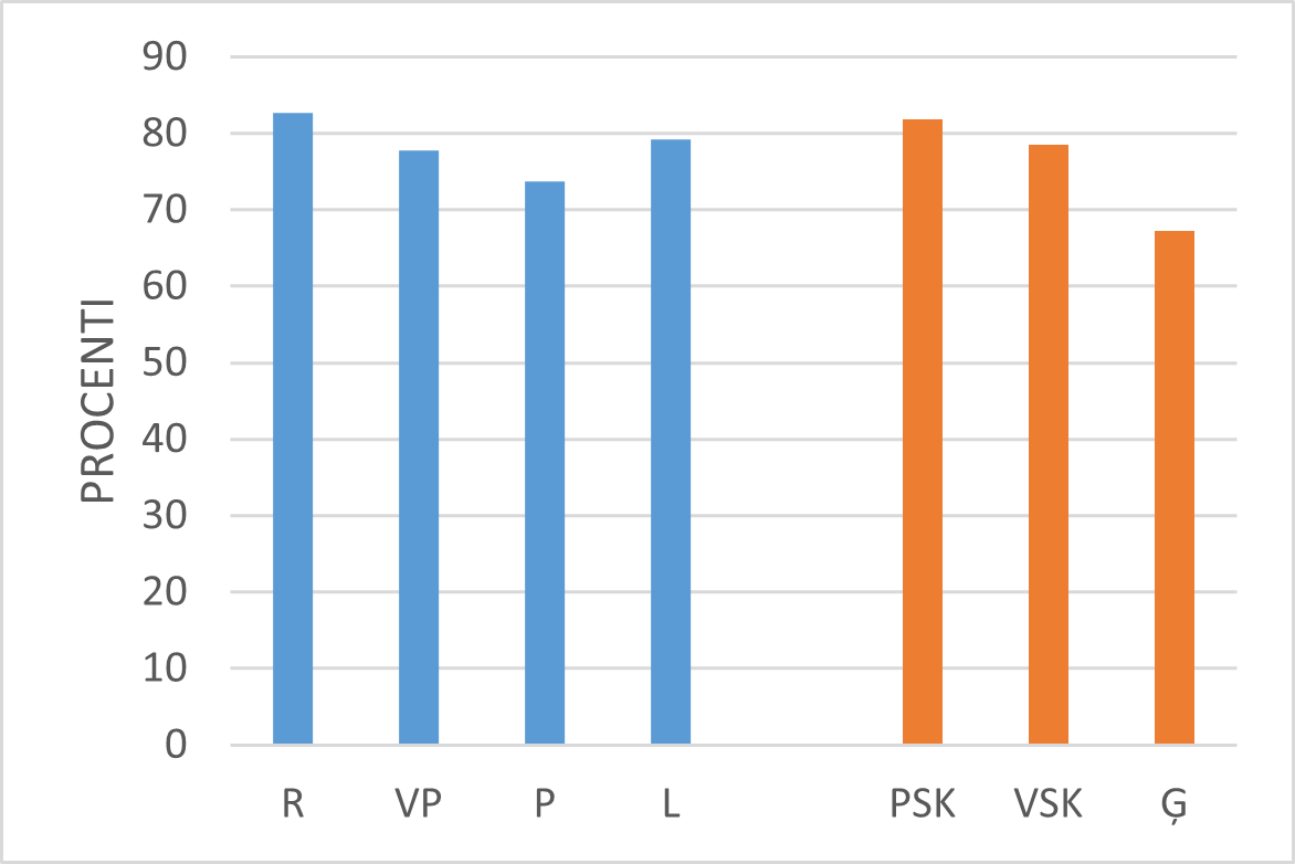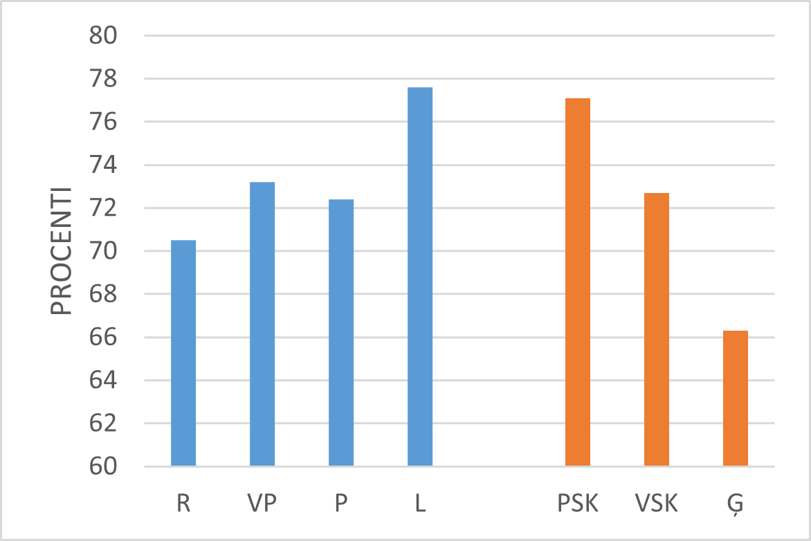 | 64. att. Skolotāju daļa, kuri skolēnos “bieži” vai “vienmēr” attīstījuši savu emociju, domu vai uzvedības izpratni. | 65. Skolotāju daļa, kuri skolēnos “bieži” vai “vienmēr” attīstījuši savu emociju, domu vai uzvedības pārvaldīšanu. |