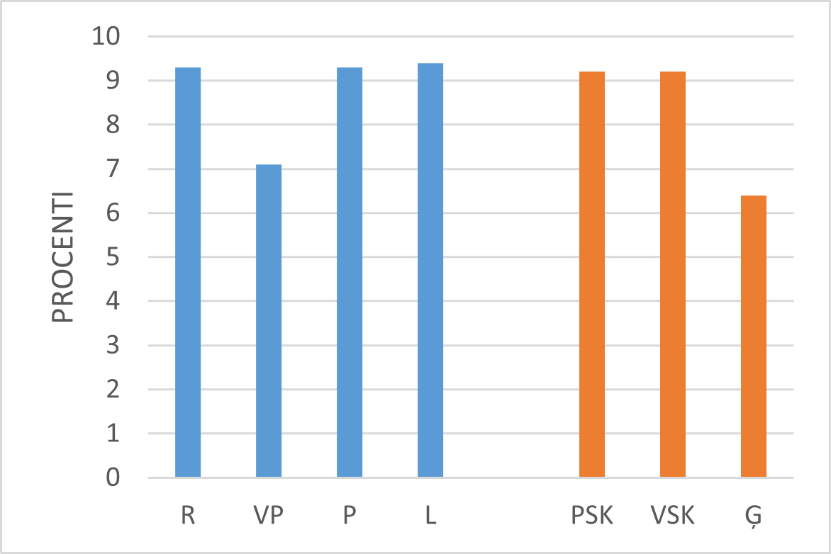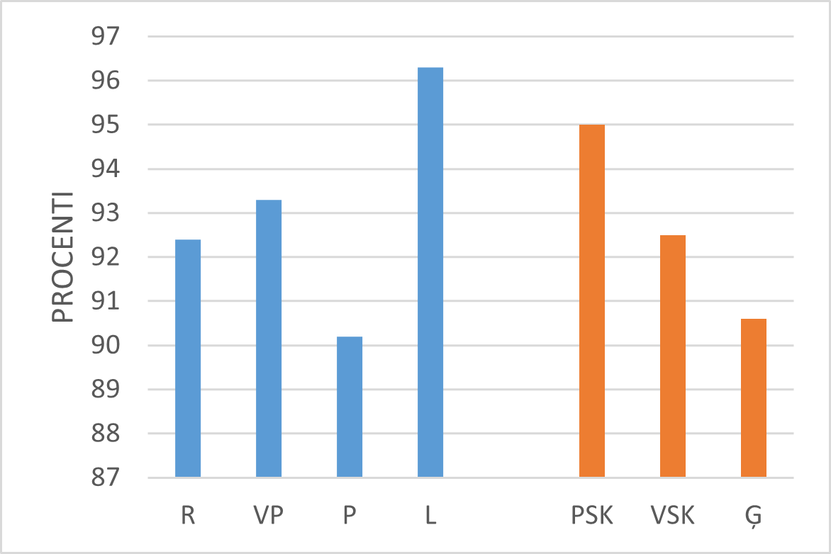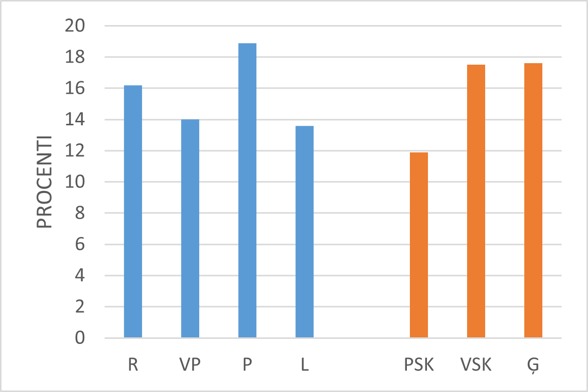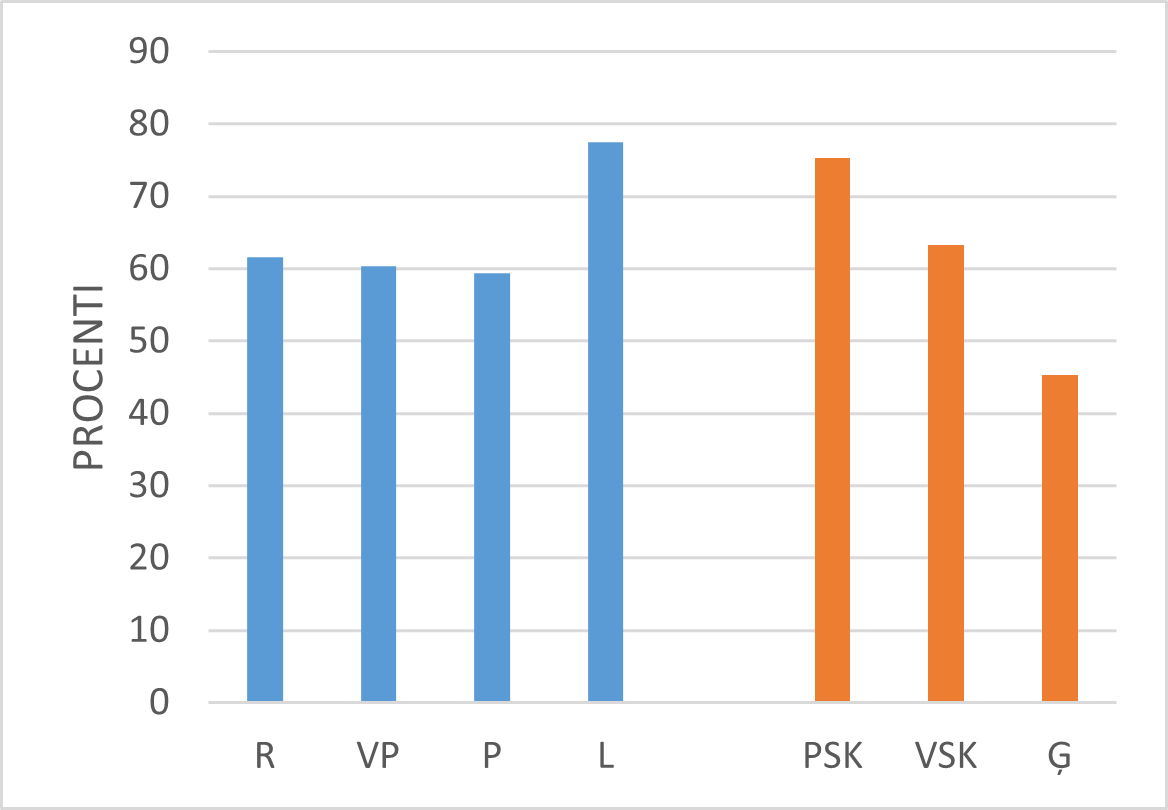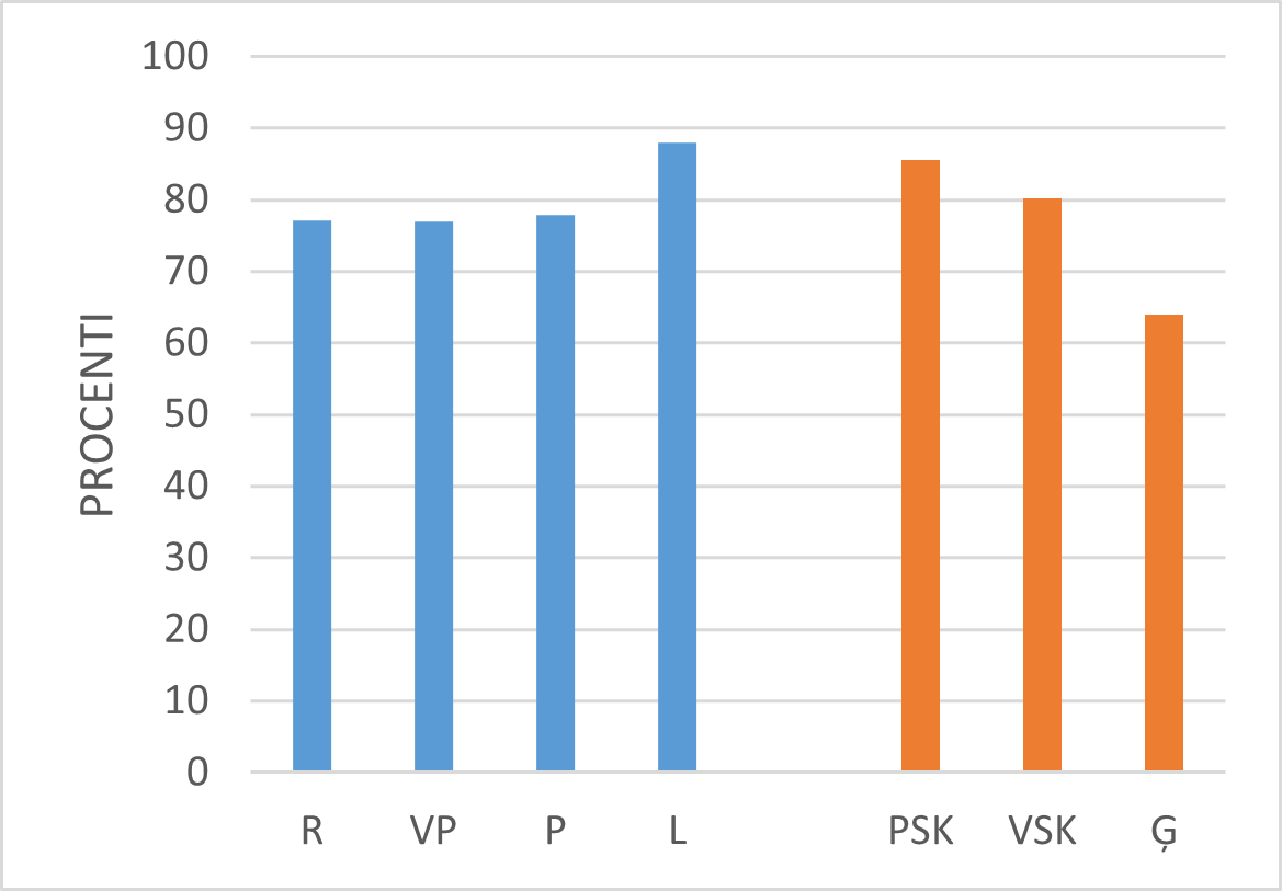 | 64. att. Skolotāju daļa, kuri skolēnos “bieži” vai “vienmēr” attīstījuši savu emociju, domu vai uzvedības izpratni. | 65. Skolotāju daļa, kuri skolēnos “bieži” vai “vienmēr” attīstījuši savu emociju, domu vai uzvedības pārvaldīšanu. |