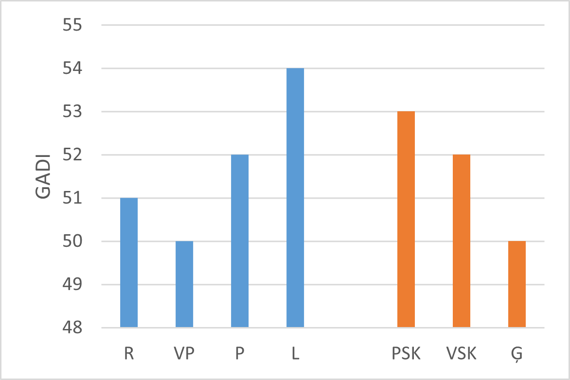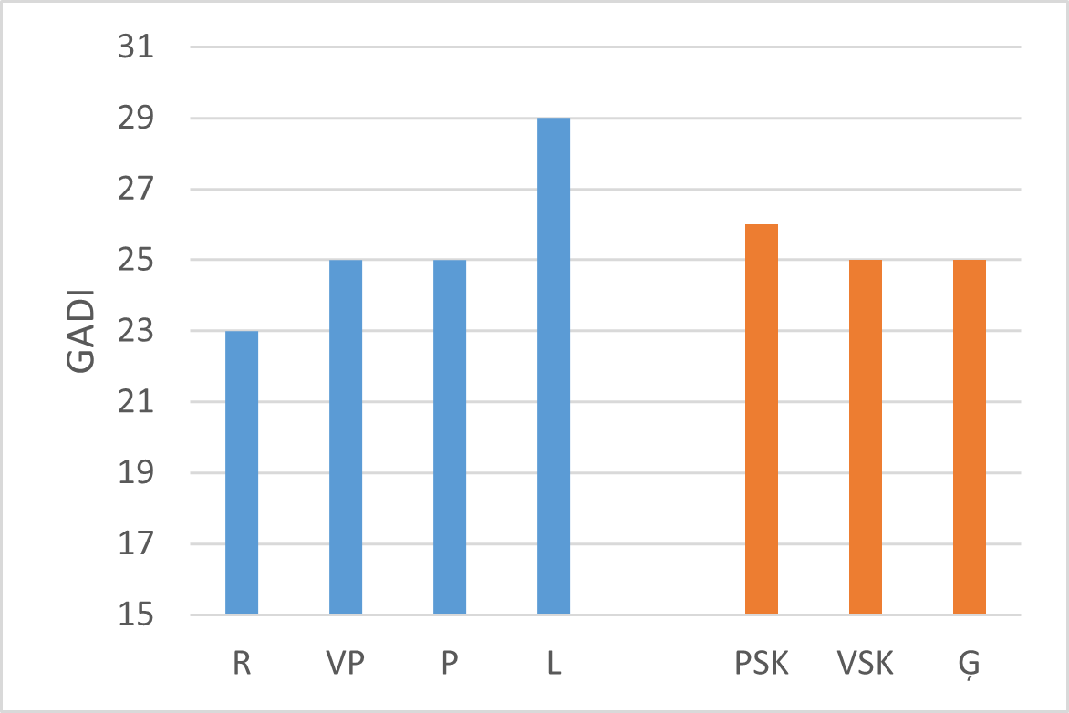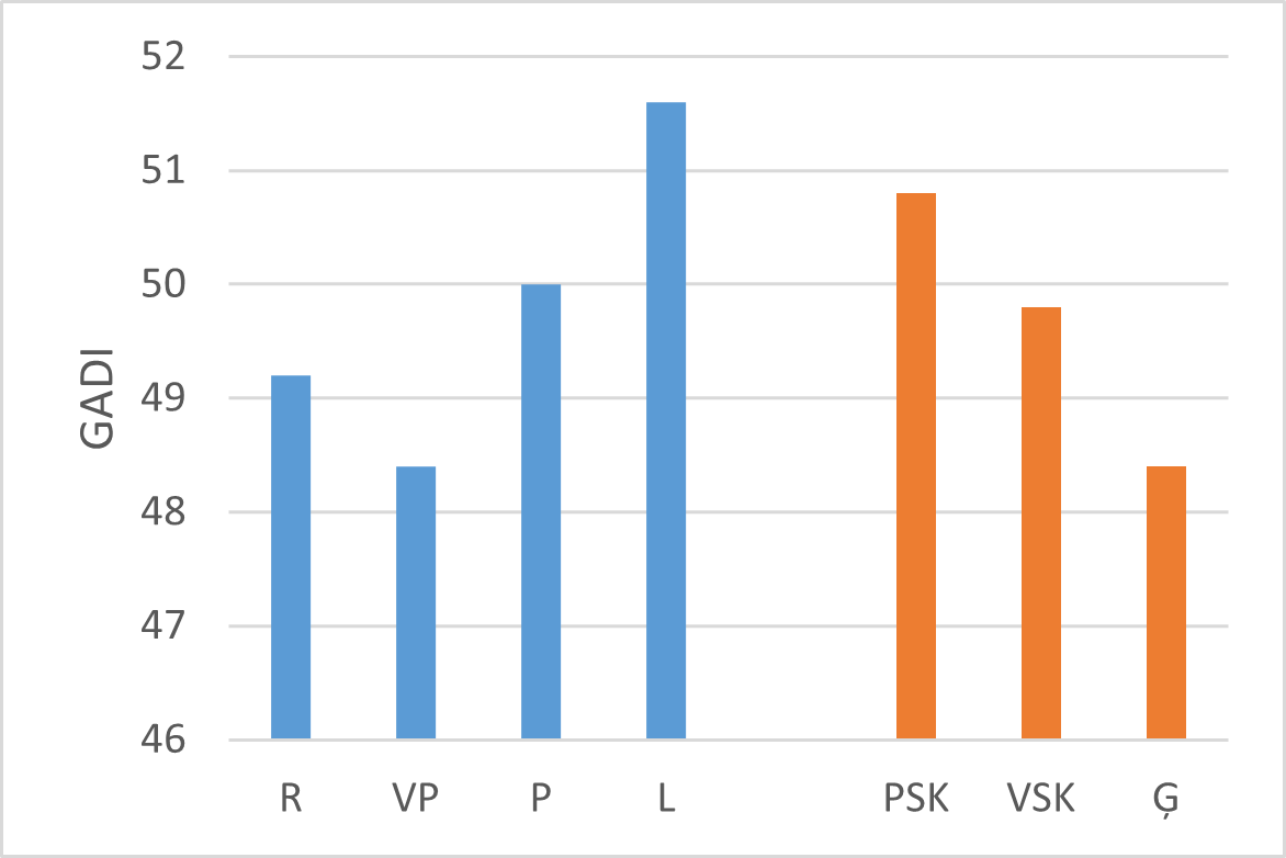 Latvijā augstāks pašvērtējums ir pamatskolu un lauku skolotājiem, zemāks ģimnāziju skolotājiem (skat 81.–86. att.). To var viegli skaidrot ar atbilstīgu klašu sastāvu.
