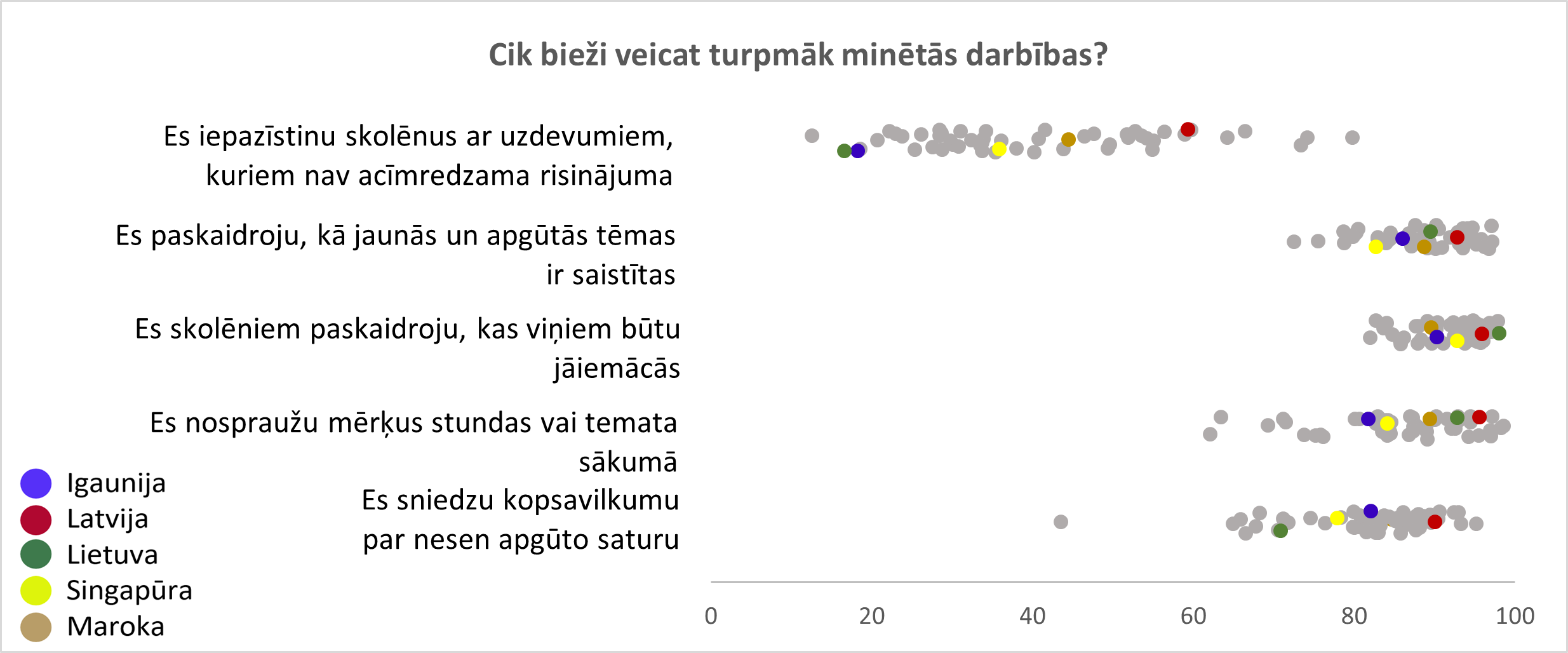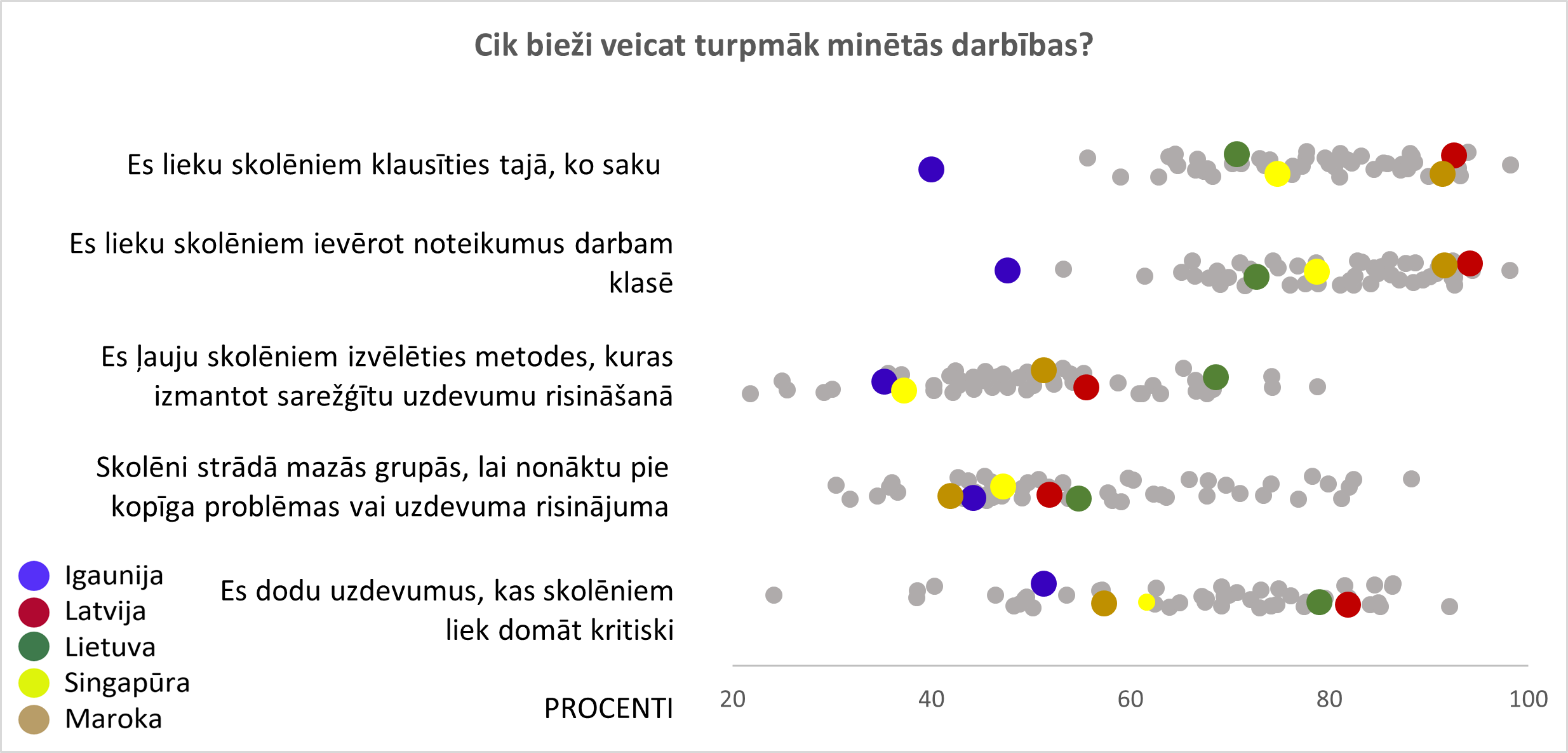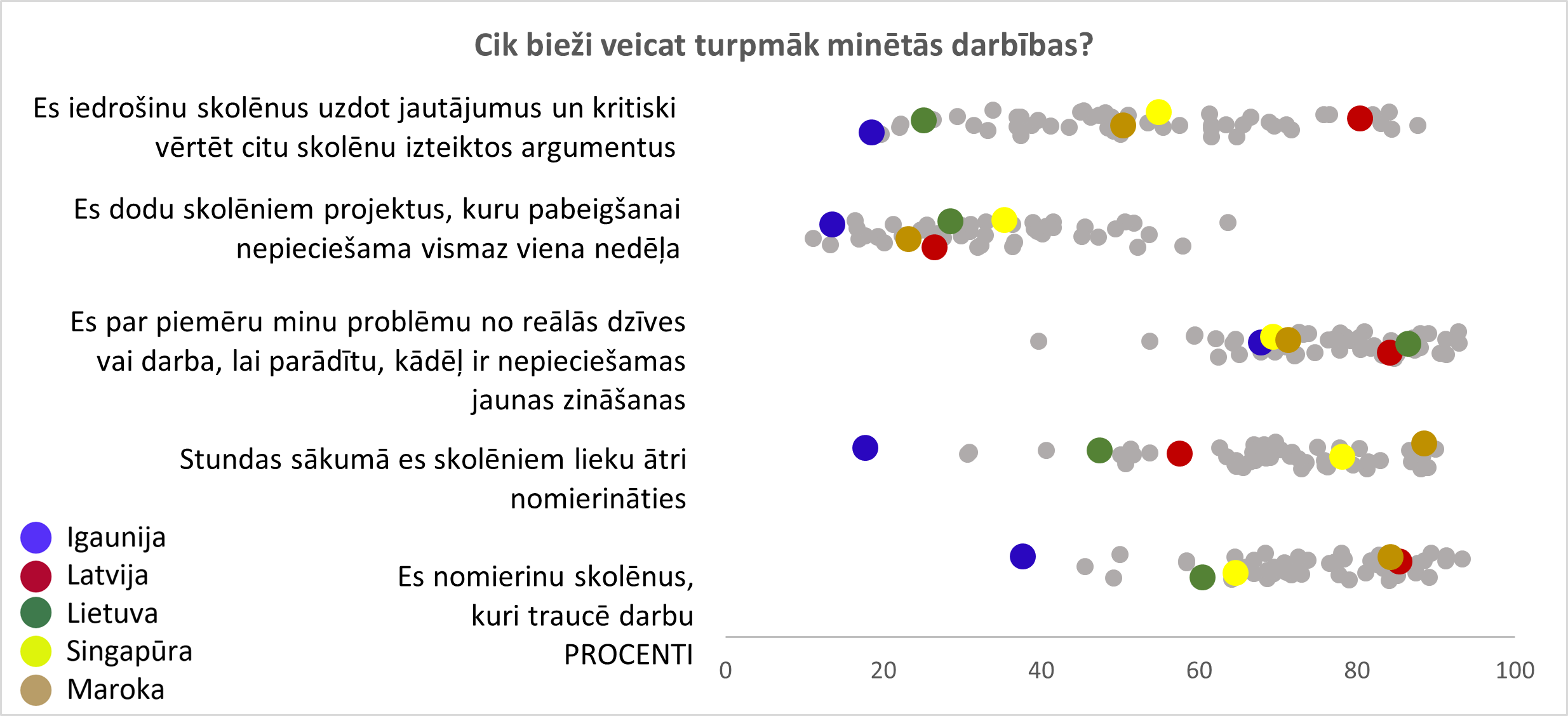 Trīs mācību prakses, par kurām vidēji ziņots visretāk, ir: (1) dot skolēniem projektus, kuru pabeigšanai nepieciešama vismaz viena nedēļa (vidēji – 28 %, Latvijā – 27 %); (2) uzdevumu prezentēšana, kuriem nav acīmredzama risinājuma (vidēji – 37 %, Latvijā – 59 %); (3) mudināt skolēnus apšaubīt un kritizēt citu studentu izteiktos argumentus (vidēji – 44 %, Latvijā – 81 %).