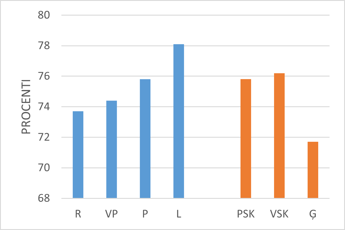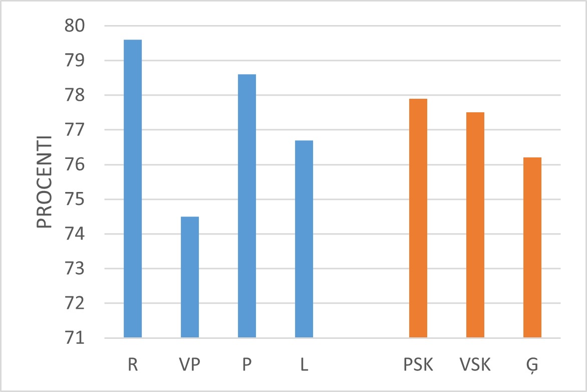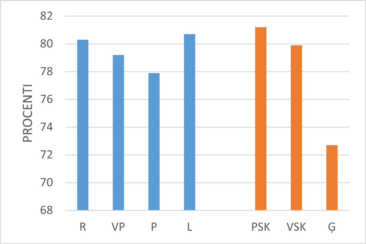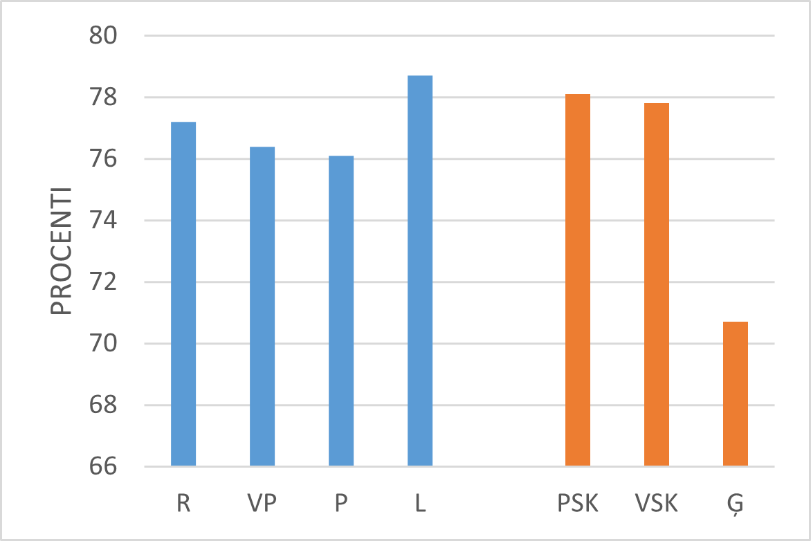 | 75. att. Skolotāju daļa procentos, kuri ziņo, ka spēj nodrošināt un veicināt izpratni par kultūras atšķirībām skolēnu vidū. | 76. att. Skolotāju daļa procentos, kuri ziņo, ka spēj panākt, ka samazinās etniskie stereotipi skolēnu vidū. |