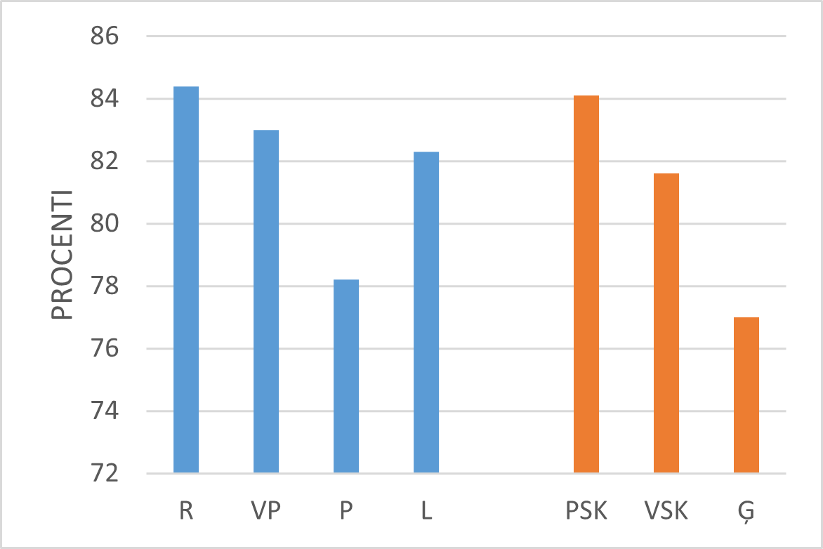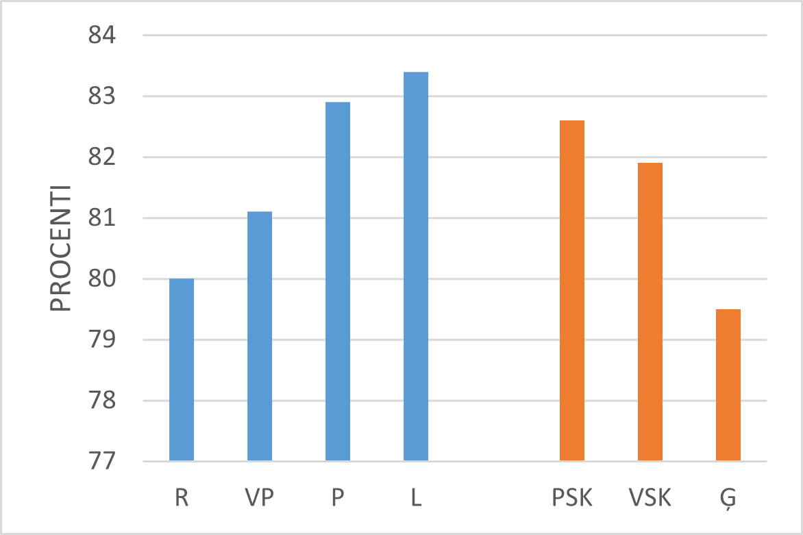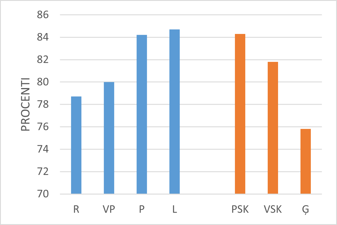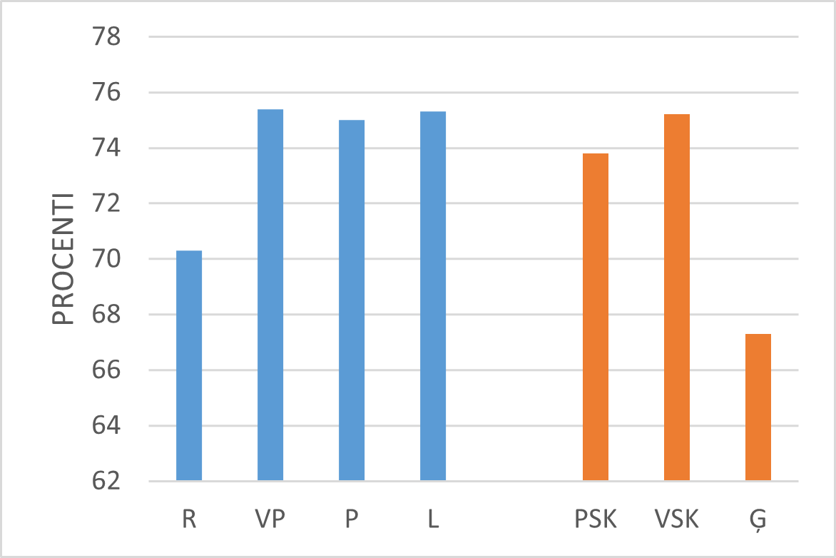 | 75. att. Skolotāju daļa procentos, kuri ziņo, ka spēj nodrošināt un veicināt izpratni par kultūras atšķirībām skolēnu vidū. | 76. att. Skolotāju daļa procentos, kuri ziņo, ka spēj panākt, ka samazinās etniskie stereotipi skolēnu vidū. |