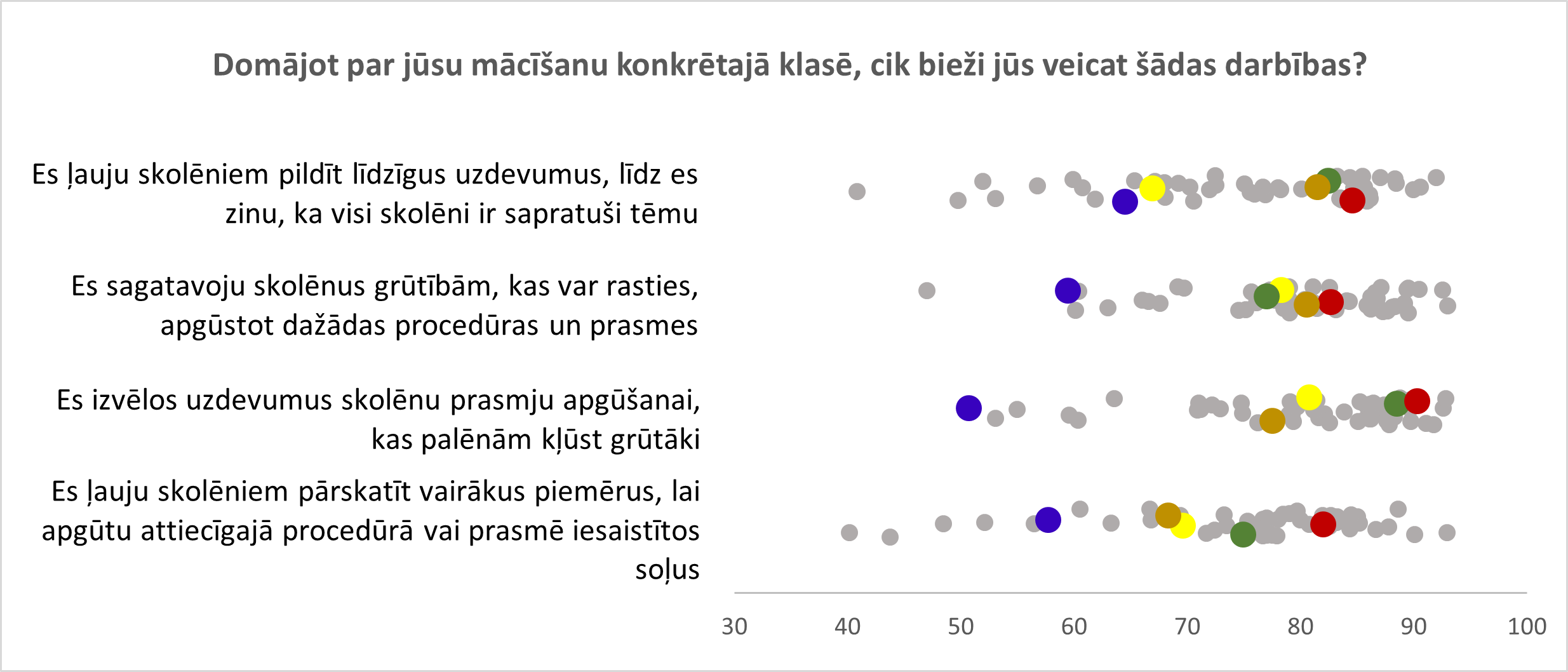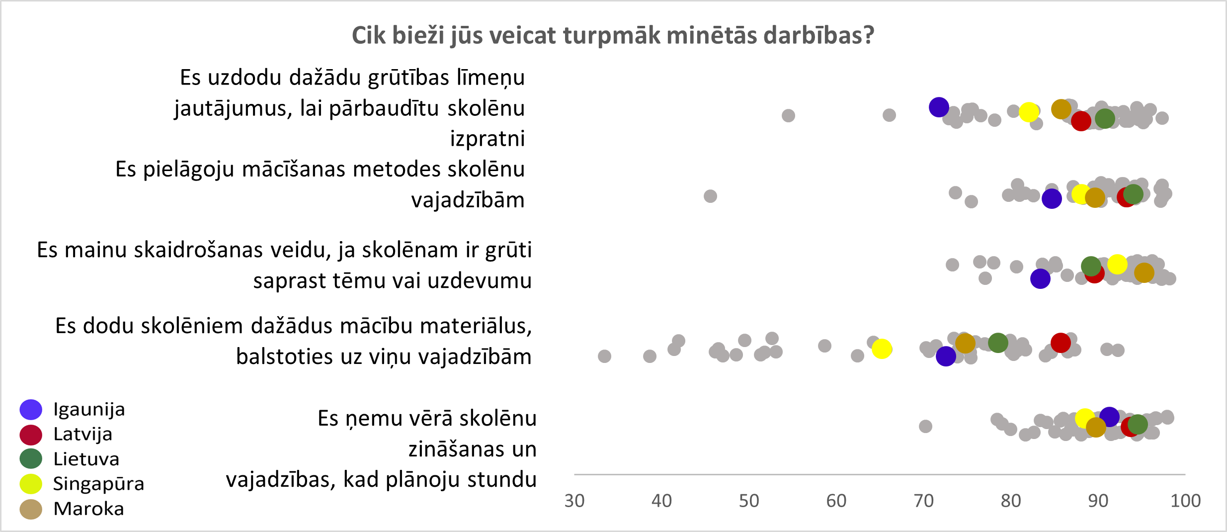 Daudzi skolotāji ziņo, ka savās stundās izmanto minētās adaptīvās prakses. Deviņi no desmit skolotājiem informē, ka “bieži” vai “vienmēr” maina tēmas vai uzdevuma skaidrošanas veidu, ja skolēnam ir grūti to saprast (Latvijā – 89 %, Igaunijā – 83 %). Aptuveni deviņi no desmit skolotājiem ziņo, ka, plānojot stundas, “bieži” vai “vienmēr” ņem vērā skolēnu zināšanas un vajadzības (Latvijā – 95 %, Igaunijā – 91 %). Turpretī tikai aptuveni seši no desmit skolotājiem norāda skolēniem uz dažādiem mācību materiāliem atkarībā no viņu vajadzībām (Latvijā – 86 %, Igaunijā – 73 %).