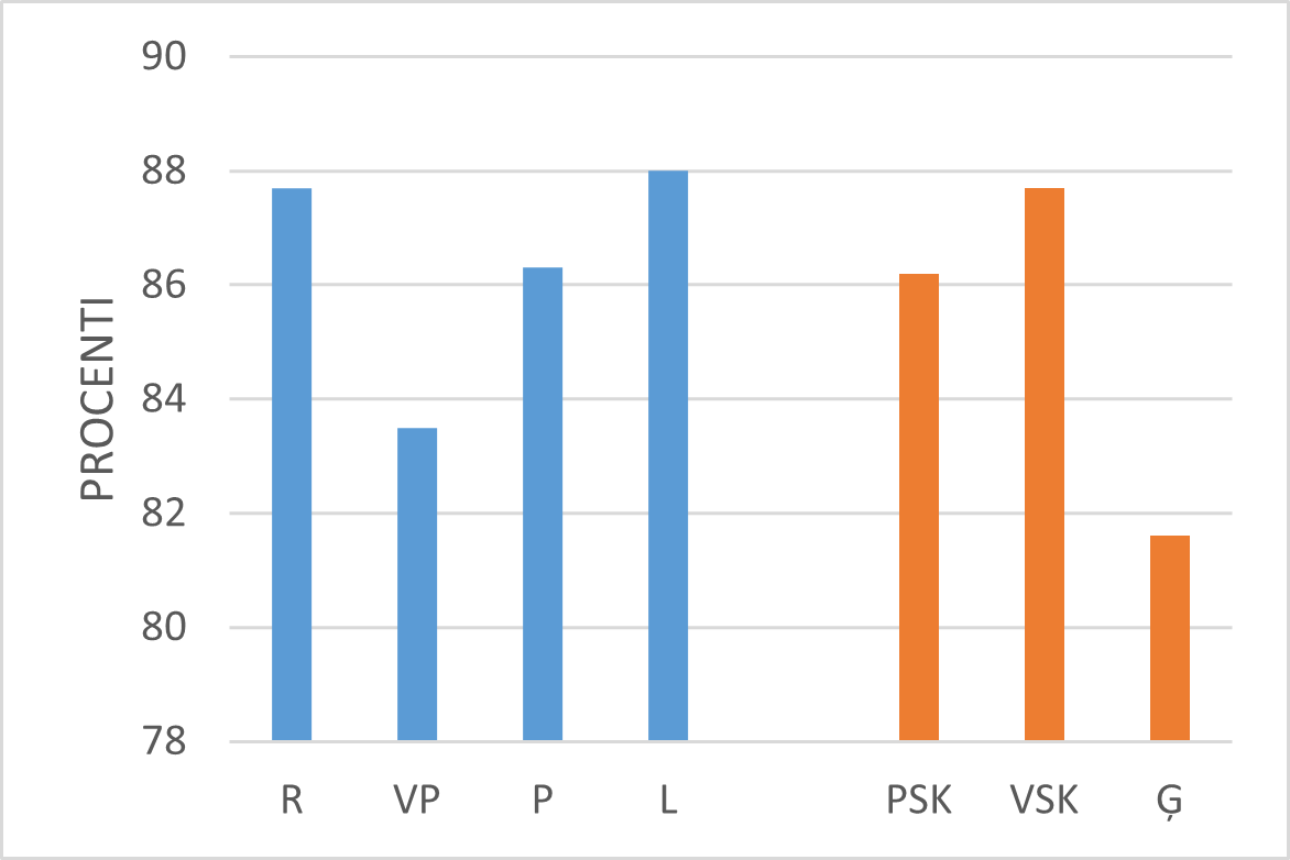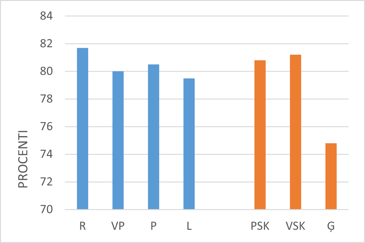 | 81. att. Skolotāju daļa procentos, kuri spēj strādāt kopā ar citiem speciālistiem un darbiniekiem, lai mācītu skolēnus ar īpašām izglītības vajadzībām. | 82. att. Skolotāju daļa procentos, kuri spēj iesaistīt bērnu ar īpašām izglītības vajadzībām vecākus/aizbildņus skolas aktivitātēs. |