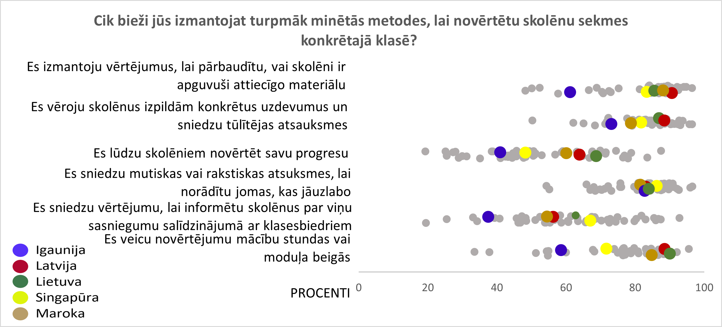 Skolotājiem ir jāsaprot, kā skolēni progresē mācībās, un jāsniedz atgriezeniskā saite, lai palīdzētu viņiem uzlabot savas prasmes. TALIS lūdz skolotājus ziņot par to, cik bieži viņi izmanto kādu konkrētu prakšu kopumu skolēnu mācību novērtēšanai savā mērķa klasē. No sešām TALIS aptaujā iekļautajām vērtēšanas praksēm vidēji četras ir plaši izplatītas. Skolotāji visbiežāk atbild ar “bieži” vai “vienmēr”: (1) skolēnu novērošana, kad viņi strādā pie konkrētiem uzdevumiem, un tūlītējas atgriezeniskās saites sniegšana (vidēji – 81 %, Latvijā – 89 %, Lietuvā – 88 %, Igaunijā – 73 %); (2) vērtējumu izmantošana, lai pārbaudītu, vai skolēni ir apguvuši konkrēto materiālu (vidēji – 78 %, Latvijā – 88 %, Lietuvā – 86 %, Igaunijā – 61 %); (3) mutiskas vai rakstiskas atsauksmes, lai norādītu, kuras jomas jāuzlabo (vidēji – 78 %; Latvijā, Lietuvā un Igaunijā 84 %); (4) vērtējumu paziņošana mācību vienības vai nodarbību bloka beigās (vidēji – 73 %, Latvijā un Lietuvā – 90 %, Igaunijā – 59 %).