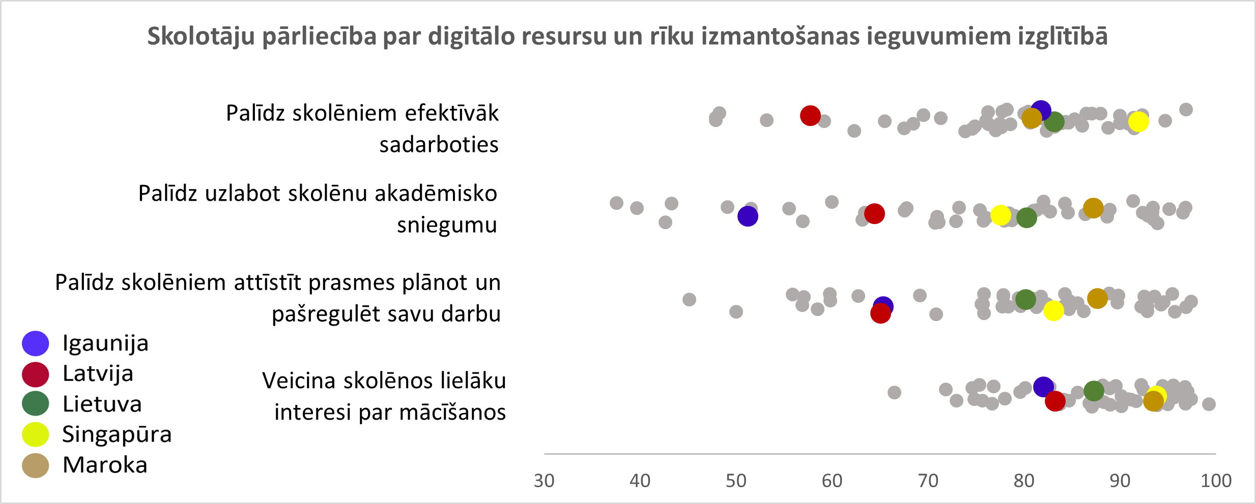 Lai novērtētu skolotāju attieksmi pret digitālo rīku un resursu lietošanu, TALIS aptaujā bija iekļauta jautājumu kopa ar atbilžu variantiem “pilnīgi nepiekrītu”, “nepiekrītu” “piekrītu” “pilnīgi piekrītu”. Attieksme pret digitālajiem rīkiem un to izmantošana skolēnu mācībās dažādās izglītības sistēmās ievērojami atšķiras. Kopumā skolotāji “piekrīt” vai “pilnībā piekrīt”, ka digitālo rīku izmantošana veicina skolēnu interesi par mācīšanos. Vidēji 85 %, Marokā un Singapūrā 94 %, Lietuvā 87 %, Latvijā 83 %, Igaunijā 82%. Tomēr viedokļi dalās par to, vai digitālie rīki uzlabo akadēmisko sniegumu, un Austrijā, Beļģijas franču kopienā, Somijā, Francijā un Zviedrijā tam piekrīt mazāk nekā 50 % skolotāju. Turpretī Albānijā, Saūda Arābijā un Vjetnamā tam piekrīt vairāk nekā 95 % skolotāju. Viedoklim, ka digitālie rīki uzlabo akadēmisko sniegumu, piekrīt 89 % skolotāju Marokā, 78 % Lietuvā un Singapūrā, 63 % Latvijā un 51 % Igaunijā. (skat. 43. un 44. att.) Latvijā nedaudz atšķirīgs viedoklis par ieguvumiem ir ģimnāziju skolotājiem. 76 % uzskata, ka digitālo rīku un resursu lietošana veicina interesi par mācīšanos, bet 55 %, ka uzlabo akadēmisko sniegumu (skat 45.–48. att.)
