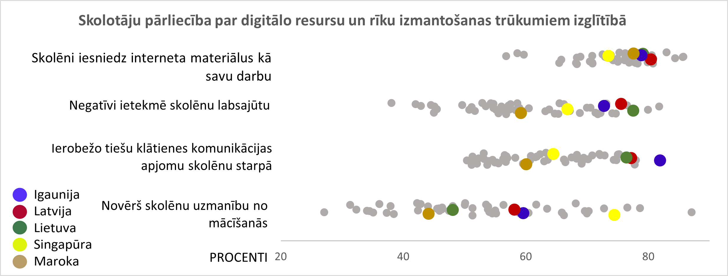 Tomēr skolotāji norāda arī uz digitālo rīku lietošanas riskiem. Latvijā, Igaunijā un Lietuvā apmēram 75 % skolotāju uzskata, ka to lietošana var negatīvi ietekmēt skolēnu labsajūtu (Singapūrā 67 %, Marokā 59 %). Šajās valstīs aptuveni 80 % skolotāju (Singapūrā 74 %) uzskata, ka skolēni var iesniegt internetā iegūtu darbu kā savu. Vidēji apmēram katrs otrais skolotājs “piekrīt” vai “pilnībā piekrīt”, ka digitālie resursi un rīki var novērst skolēnu uzmanību no mācīšanās. Šis uzskats ievērojami atšķiras – Austrālijā, Norvēģijā un Zviedrijā aptuveni astoņi no desmit vai vairākiem skolotājiem piekrīt minētajam apgalvojumam, salīdzinot ar tikai trim no desmit skolotājiem Itālijā un Turcijā.