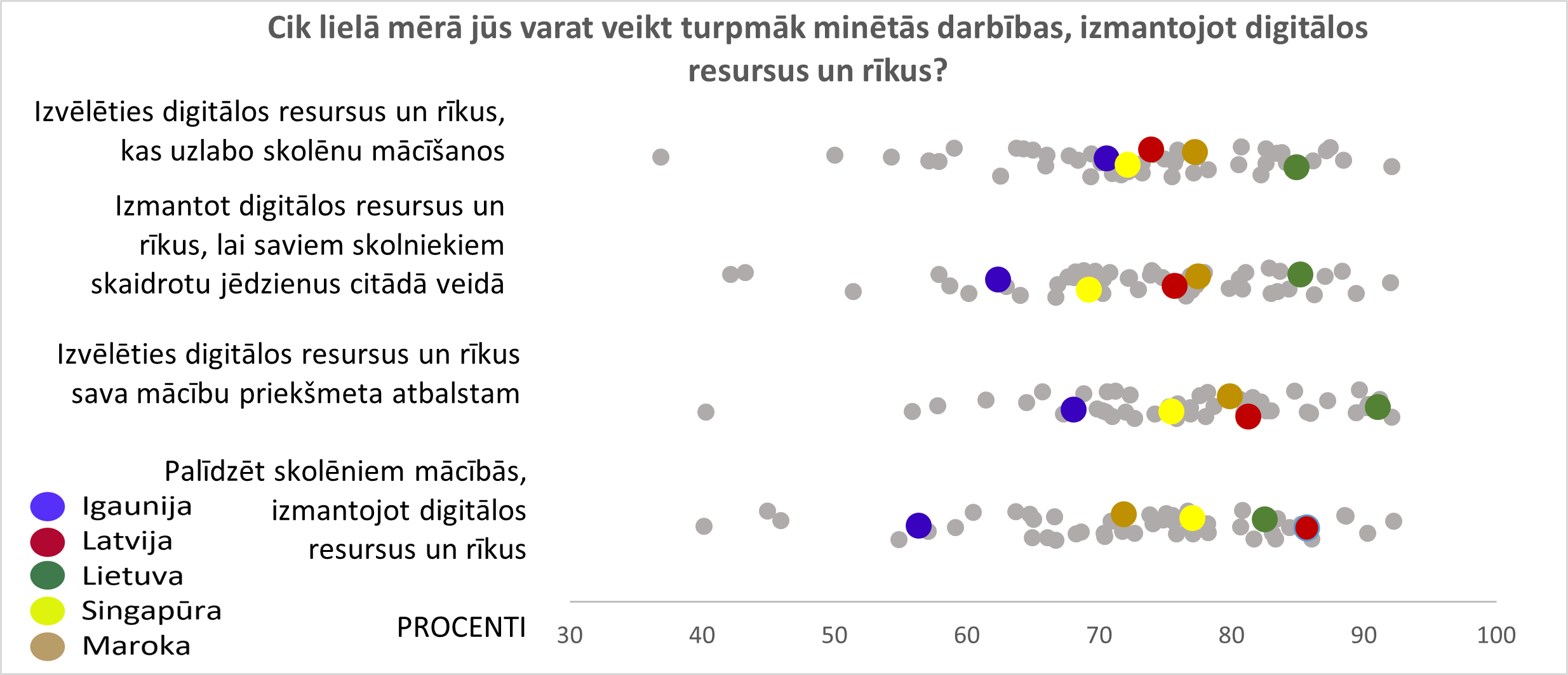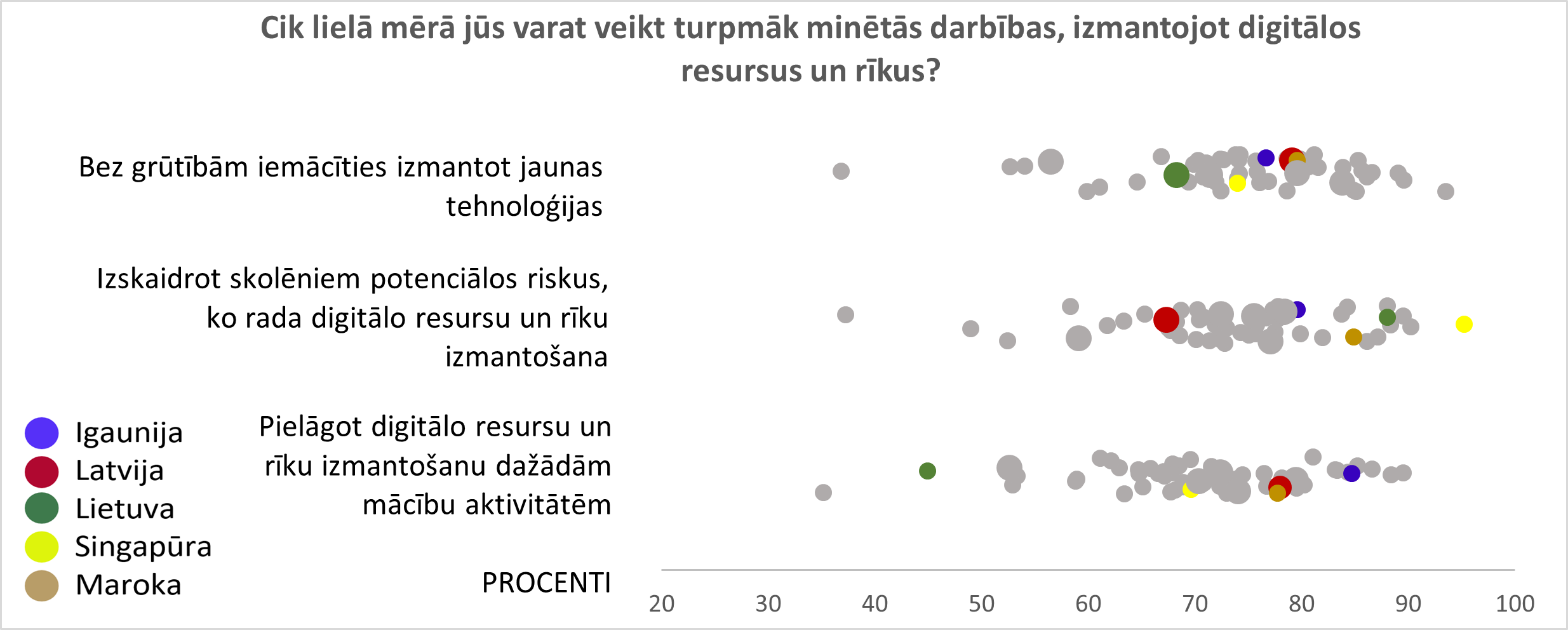 Skolotāju pašvērtējums saistībā ar digitālo rīku lietošanu sniedz ieskatu par to, cik pārliecināti viņi jūtas, izmantojot tehnoloģijas klasē (skat 51. un 52. att. ). Vidēji OECD valstīs 75 % skolotāju (Lietuvā 84 %, Latvijā 74%, Igaunijā 71 %) ziņo, ka spēj noteikt savam priekšmetam atbilstīgus digitālos resursus. 70 % skolotāju spēj palīdzēt skolēniem mācībās, izmantojot digitālos rīkus (Latvijā – 86 %, Lietuvā – 83 %, Igaunijā – 56 %). Vidēji 75 % skolotāju spēj izvēlēties digitālos resursus un rīkus sava priekšmeta mācīšanai (Lietuvā 91 %, Latvijā – 82 %, Igaunijā – 68 %). Vidēji Latvijas skolotāji retāk (67 %) nekā daudzu citu valstu (vidēji 72 %, Singapūra – 95 %, Lietuva – 88 %, Maroka – 85 %, Igaunija – 80 %) skolotāji spēj skolēniem izskaidrot potenciālos riskus, ko rada digitālo resursu un rīku izmantošana. Latvijā zemāks skolotāju pašvērtējums ir Rīgas un ģimnāziju skolotājiem (skat. 53. un 54. att.).