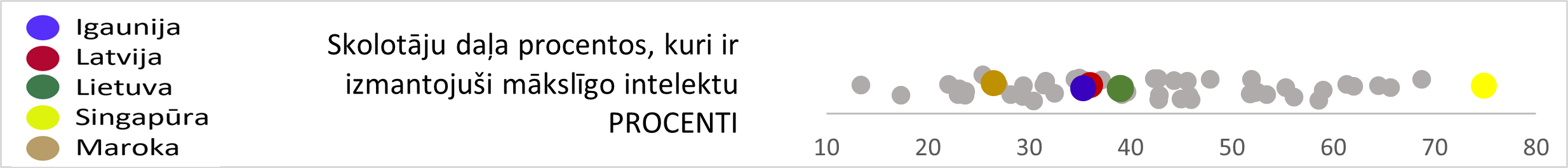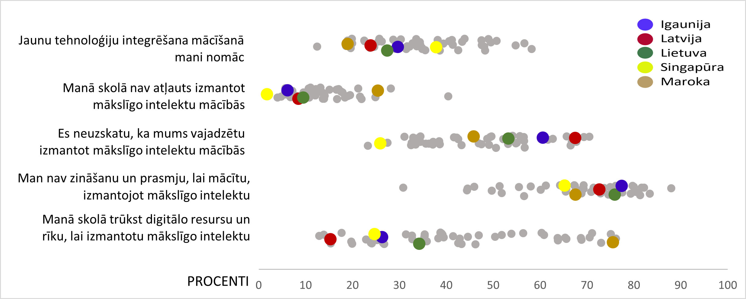 Vidēji trīs no četriem skolotājiem ziņo, ka viņiem trūkst zināšanu vai prasmju, lai mācītu skolēnus, izmantojot MI. Tādu skolotāju Singapūrā ir 65 %, Marokā – 68 %, Latvijā – 73 %, Lietuvā – 76 %, Igaunijā 81 %. Apmēram puse skolotāju neuzskata, ka MI būtu jāizmanto mācīšanā. Tādu skolotāju Singapūrā ir 26%, Lietuvā – 54 %, Marokā 68 %, Igaunijā – 61 %, Latvijā – 68 %. Runājot par skolas politiku, viens no desmit skolotājiem informē, ka viņa skola neļauj izmantot MI mācīšanā.