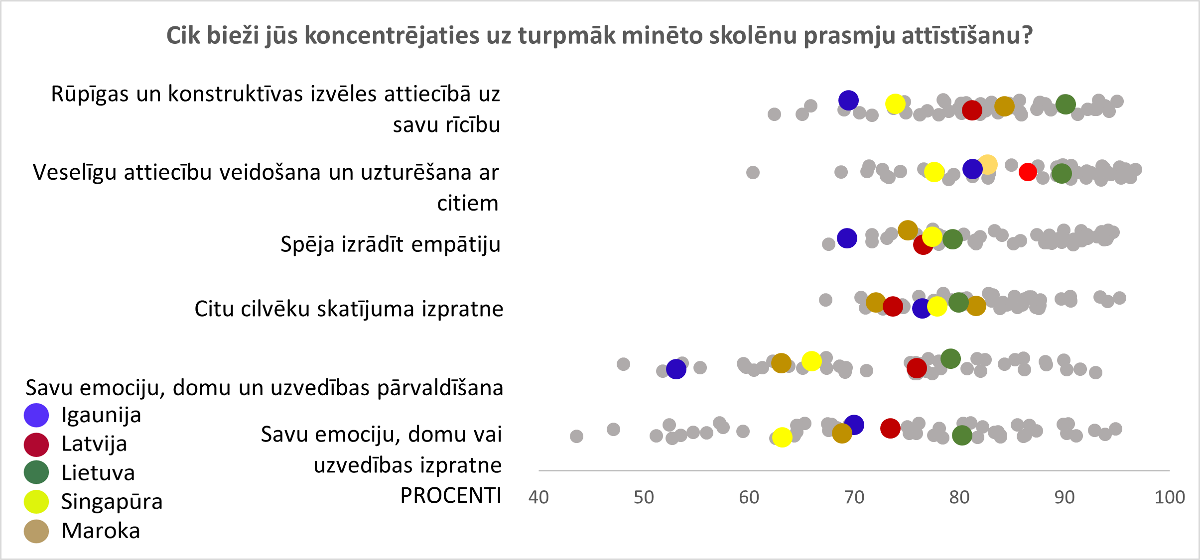 Apmēram astoņi no desmit skolotājiem ziņo, ka viņi “bieži” vai “vienmēr” koncentrējas uz skolēnu prasmju attīstīšanu, lai viņi spētu veidot un uzturēt veselīgas attiecības (Lietuvā – 90 %, Latvijā – 87 %, Igaunijā – 81 %), justu empātiju (Lietuvā – 79 %, Latvijā – 78 %, Igaunijā – 69 %), izprastu citu viedokli (Lietuvā – 80 %, Igaunijā – 77 %, Latvijā – 74 %), kā arī spētu pieņemt atbildīgus un konstruktīvus lēmumus par savu rīcību (Lietuvā – 90 %, Latvijā – 81 %, Igaunijā – 69 %),. Gandrīz septiņi no desmit skolotājiem informē, ka “bieži” vai “vienmēr” attīsta skolēnu prasmes izprast savas emocijas, domas, uzvedību (Lietuvā – 80 %, Latvijā – 74 %, Igaunijā – 69 %), kā arī pārvaldīt tās ((Lietuvā – 79 %, Latvijā – 76 %, Igaunijā – 53 %). Kā redzams, tad no trim Baltijas valstīm lielāko vērību sociālo un emocionālo prasmju attīstībai pievērš Lietuvā, Mazāko – Igaunijā.