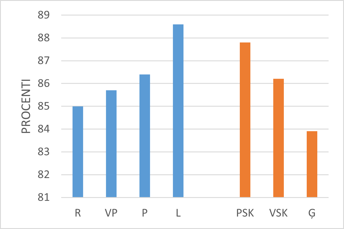 | 85. att. Skolotāju daļa procentos, kuri spēj izstrādāt mācību uzdevumus, lai tie būtu piemēroti skolēniem ar īpašām izglītības vajadzībām | 86. att. Skolotāju daļa procentos, kuri spēj pielāgot valsts mēroga vērtēšanas sistēmu tā, lai varētu novērtēt visus skolēnus ar īpašām izglītības vajadzībām. |