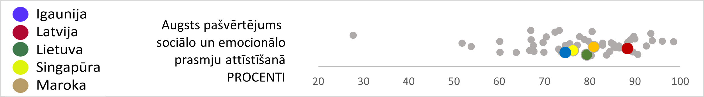 Rezultāti dažādās izglītības sistēmās atšķiras, skolotājiem ziņojot, ka viņi “bieži” vai “vienmēr” koncentrējas uz sociālo un emocionālo prasmju attīstīšanu. Aptuveni deviņi no desmit skolotājiem apgalvo, ka to dara (veicinot visas sešas uzskaitītās prasmes : a) savu emociju, domu vai uzvedības izpratne; b) savu emociju, domu vai uzvedības pārvaldīšana; c) citu cilvēku skatījuma izpratne; d) spēja izrādīt empātiju; e) veselīgu attiecību veidošana un uzturēšana ar citiem; f) rūpīga un konstruktīva izvēle attiecībā uz savu rīcību) Albānijā, Itālijā, Rumānijā, Saūda Arābijā, Šanhajā (Ķīnā) un Apvienotajos Arābu Emirātos. No otras puses, atšķirīgāki ir skolotāju ziņojumi Austrālijā (no 53 % līdz 75 % sešām prasmēm), Beļģijas franču kopienā (no 47 % līdz 80 %), Somijā (no 51 % līdz 71 %) un Zviedrijā (no 44 % līdz 73 %). Tas varētu liecināt, ka šajās valstīs ir īpaša sociālās un emocionālās mācīšanas politika. Igaunijā šie skaitļi ir no 50 līdz 80 %, Latvijā – 75 līdz 85 %, Lietuvā – 80 līdz 90 %, Singapūrā – 65 līdz 80 %. (skat 63. att.).