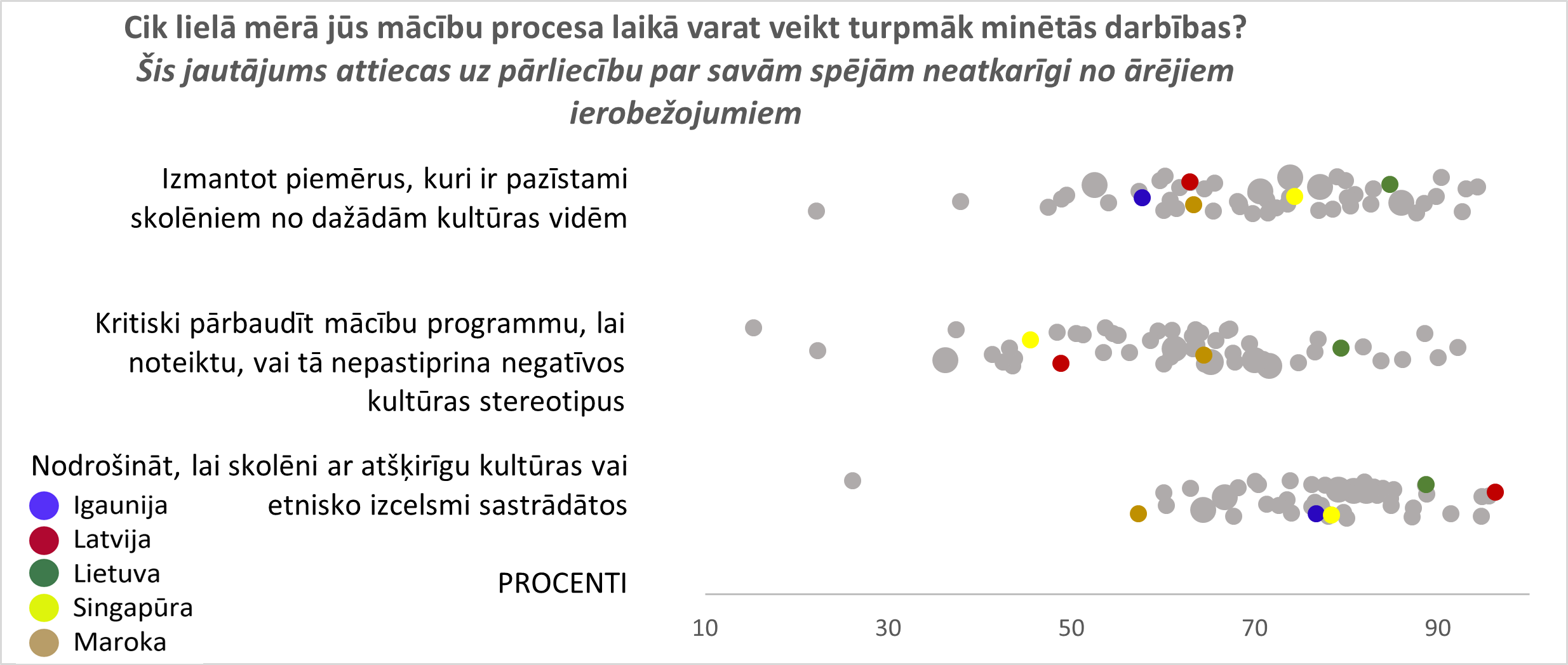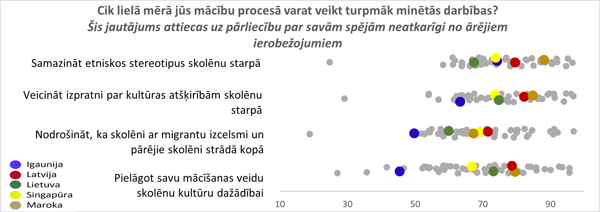 Skolotāji ziņo par dažādu pašefektivitātes līmeni, mācot multikulturālā vidē. Vidēji aptuveni septiņi no desmit skolotājiem jūtas pārliecināti, ka viņi var veicināt sadarbību starp skolēniem ar atšķirīgu kultūru vai etnisko izcelsmi (Latvijā – 96 %, Lietuvā – 89 %, Igaunijā – 77 %), mazinot etnisko stereotipizēšanu skolēnu vidū (Latvijā – 80 %, Lietuvā un Igaunijā 74 %) un palielinot izpratni par kultūras atšķirībām skolēnu vidū (Latvijā – 82 %, Lietuvā – 75 %, Igaunijā – 63 %). Tomēr tikai aptuveni pieci no desmit skolotājiem uzskata, ka viņi var kritiski izvērtēt mācību programmu, lai noteiktu, vai tā pastiprina negatīvus kultūras stereotipus vai ne.