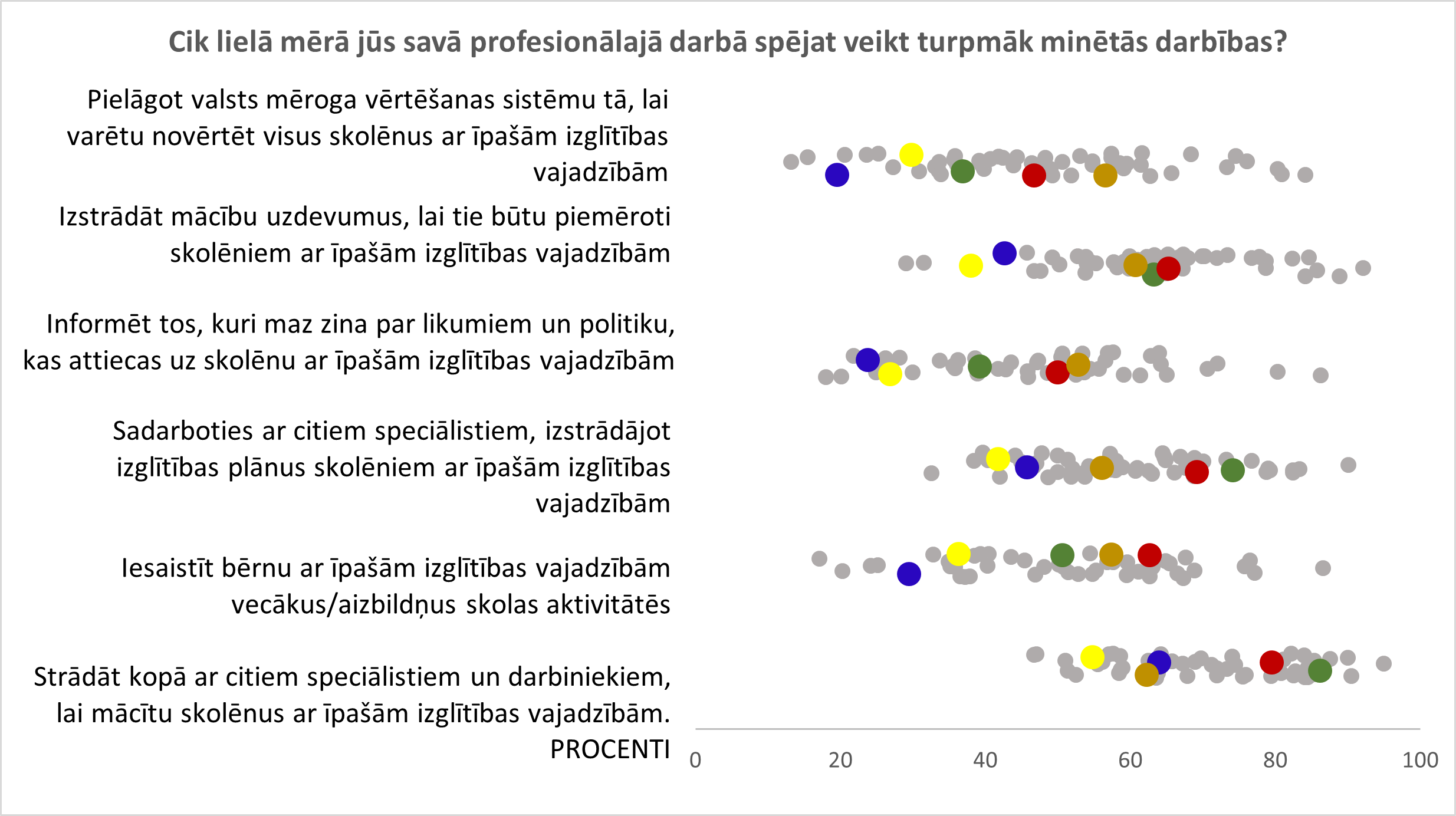 Vidēji aptuveni septiņi no desmit skolotājiem ziņo, ka viņi var sadarboties ar citiem speciālistiem un darbiniekiem, lai mācītu skolēnus ar īpašām izglītības vajadzībām klasē. Turpretī tikai aptuveni četri no desmit skolotājiem jūtas pārliecināti par savām spējām pielāgot standartizētus vērtējumus skolēniem ar īpašām izglītības vajadzībām. Līdzīgs skaits skolotāju jūtas ērti, informējot citus par likumiem un politiku, kas attiecas uz skolēnu ar īpašām izglītības vajadzībām iekļaušanu. Latvijas skolotāju pašvērtējums aptuveni atbilst OECD vidējam (skat. 80. att.).