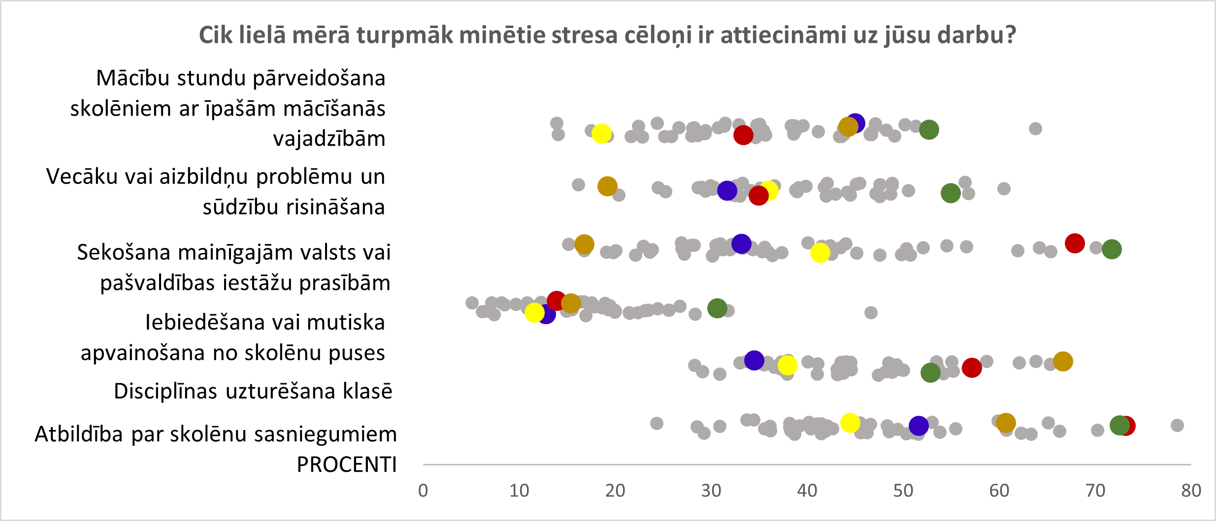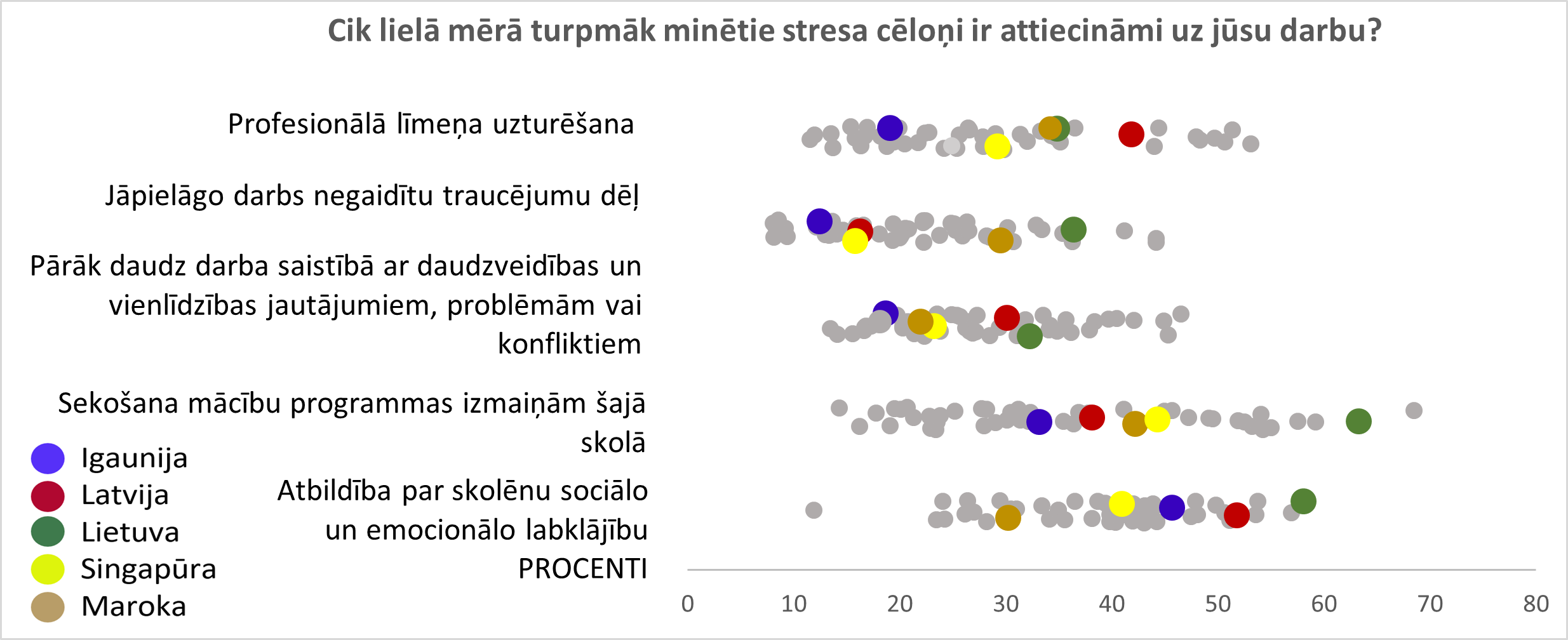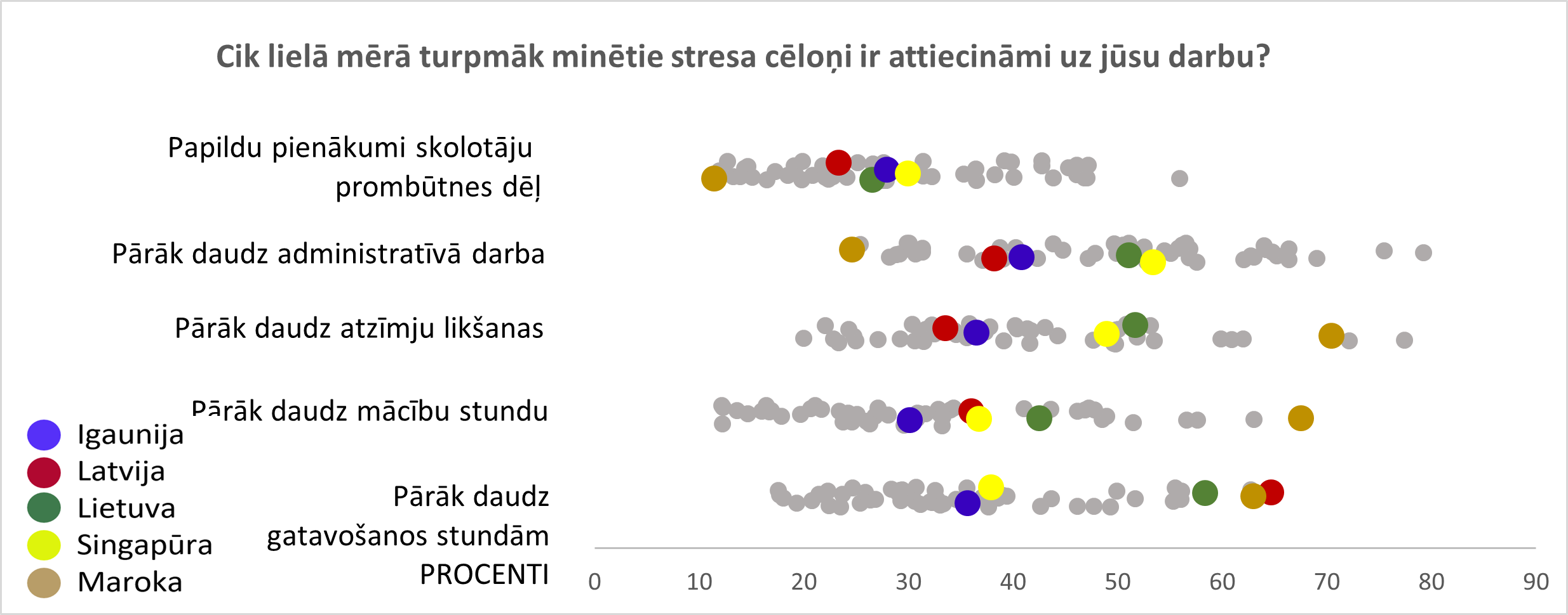 No 16 minētajiem stresa cēloņiem Latvijas skolotāji nosaukuši trīs, kas vairāk nekā 30 procentpunktus pārsniedz OECD valstu vidējos, un vēl trīs, kas tos pārsniedz vairāk nekā par 10 procentpunktiem. Latvijā 65 % skolotāju stresu izsauc pārlieku ilgā gatavošanās stundām. Tas kopumā ir maksimālais no visām pētījuma dalībvalstīm. Te jāatzīmē arī Latvijas skolas direktoru viedoklis, ka skolotāju spējas kvalitatīvi mācīt ievērojami ietekmē mācību materiālu trūkums vai neatbilstība. Šis direktoru viedoklis ir lielākais no visām pētījuma dalībvalstīm. 68 % Latvijas skolotāju stresu rada nepieciešamība sekot valsts vai pašvaldības iestāžu mainīgajām prasībām. Tikai nedaudz vairāk skolotājiem Lietuvā un Maltā šis ir stresa avots (attiecīgi 70 un 72 %). Trešais atšķirīgais stresa cēlonis ir atbildība par skolēnu sasniegumiem. Uz to norāda 73 % Latvijas skolotāju, biežāk tikai Portugāles skolotāji – 78 %. Par 17 procentpunktiem biežāk, salīdzinot ar OECD vidējiem datiem, Latvijas skolotāji nosauc profesionālā līmeņa uzturēšanu, par 12 – disciplīnas uzturēšanu klasē un atbildību par skolēnu sociālo un emocionālo labklājību (skat. 88.–90. att.).