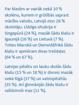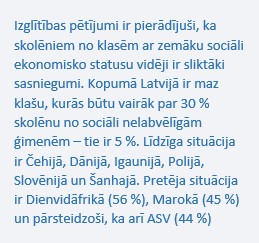 Izglītības pētījumi ir pierādījuši, ka skolēniem no klasēm ar zemāku sociāli ekonomisko statusu vidēji ir sliktāki sasniegumi. Skolotājiem informācija par sociālekonomiski nelabvēlīgām ģimenēm savās klasēs ir svarīga, lai maksimāli mazinātu šo ietekmi uz mācībām. Kopumā Latvijā ir maz klašu, kurās būtu vairāk par 30 % skolēnu no sociāli nelabvēlīgām ģimenēm – tie ir 5 %. Līdzīga situācija ir Čehijā, Dānijā, Igaunijā, Polijā, Slovēnijā un Šanhajā. Pretēja situācija ir Dienvidāfrikā (56 %), Marokā (45 %) un pārsteidzoši, ka arī ASV (44 %).