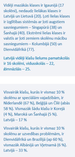 Skolotāju mācīšanas prakse ir saistīta arī ar skolēnu skaitu klasē. Vidēji mazākās klases ir Igaunijā (17 skolēni), nedaudz lielākas klases ir Latvijā un Lietuvā (20). Ļoti lielas klases ir izglītības sistēmās ar ļoti augstiem sasniegumiem – Singapūrā (38) un Šanhajā (40). Ekstrēmi lielas klases ir valstīs ar ļoti zemiem skolēnu mācību sasniegumiem – Kolumbijā (50) un Dienvidāfrikā (77). Latvijā pamatskolās klasē ir vidēji 16 skolēni, vidusskolās – 22, ģimnāzijās – 25.